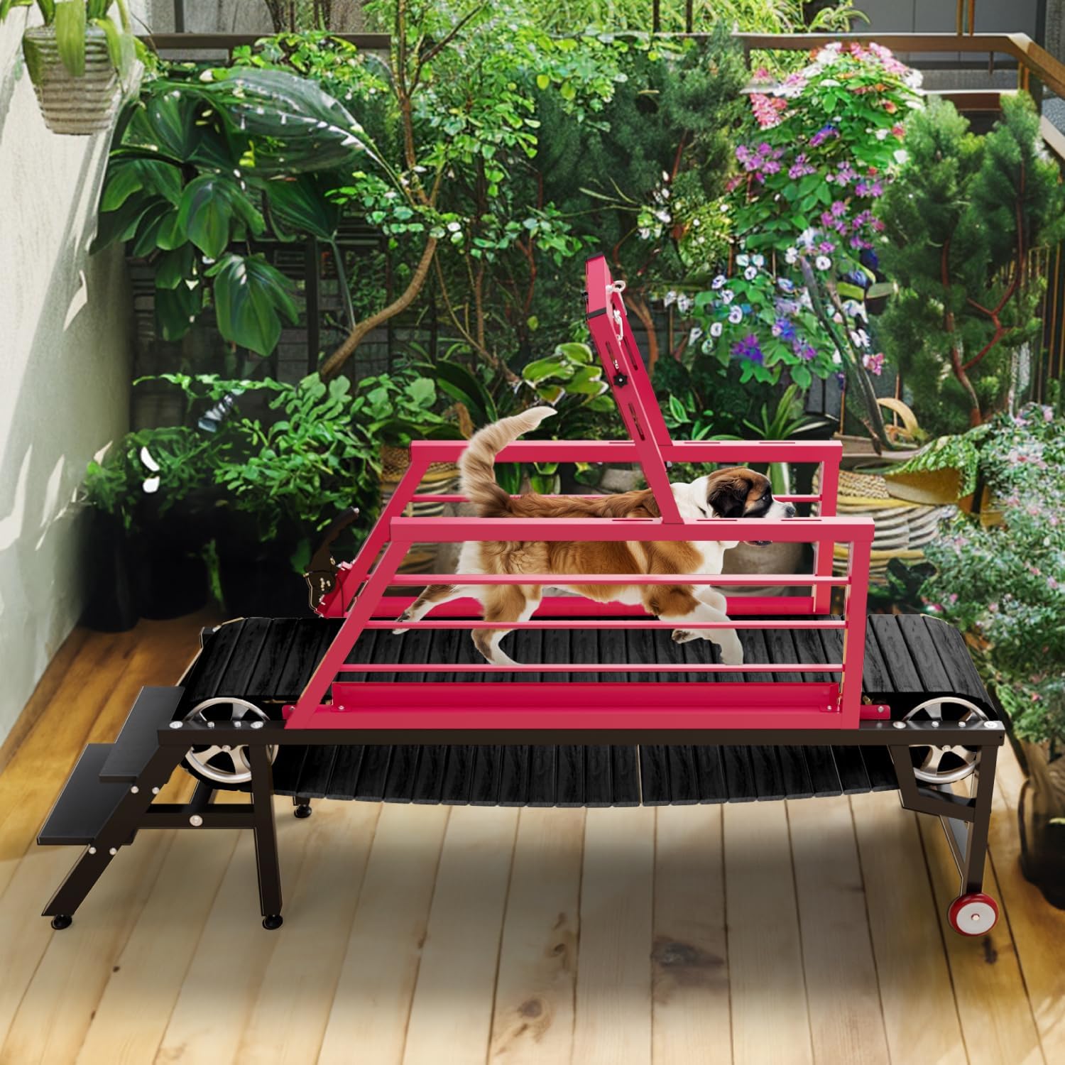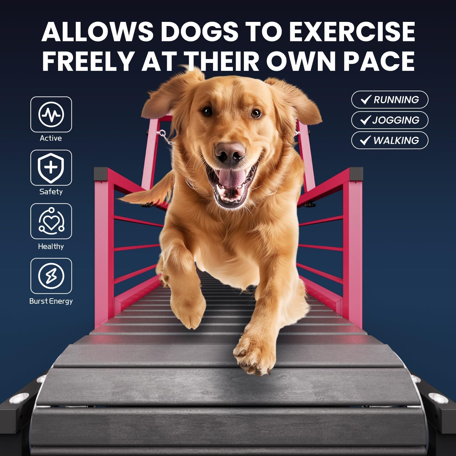 About this item 【High Quality】The dog treadmill frame is made of carbon steel coated with a layer of sturdy coating, and the belt is made of solid wood, not synthetic wood, to prevent your dog's paws from being scratched. In addition, you can adjust the safety chain up and down and adjust the frame front and back to fit dogs of different sizes for better safety and comfort. Make it easy to walk your dog after a busy day 【Keep Healthy】It is a safe and convenient way to let your dog exercise on a treadmill. It allows your dog to control weight, build muscle, and stimulate healthy development. Sticking to daily exercise can promote metabolism, allowing your pet to burn fat faster, making your dog healthier, happier, and live longer. Slatmill for dogs are the perfect way to exercise dogs 【No motor is safer】Dog treadmills for medium dogs are non-electric. Your dog will not be forced to run, and if it doesn't want to run, it can stop at any time. You can interact with your dog and lead them to walk and run with treats. The pet treadmill adopts an upgraded thick steel frame, and uses the iron chain above the frame to fix the dog's position to prevent the dog from running or losing balance during exercise. Multiple protection measures make the dog safer during exercise 【Convenient design】This dog treadmill for large dogs has double rollers, which makes it easy to move the treadmill to where you want it, whether indoors or outdoors. In addition, we have configured a handbrake device, so if the dog likes to run, let it keep running. When you think it's time to stop, you can pull down the handbrake to stop it. Add extra convenience to this excellent exercise companion 【No matter when】Since dogs are mostly energetic, they need to maintain a proper amount of exercise every day. Whether it is raining, snowing, the sun is too strong or the road is too hot, or you are too busy at work or occasionally lazy, you can use a dog treadmill to keep your dog's daily exercise and consume energy. Avoid the problems encountered when walking your dog at dawn, late at night or on busy streets. This is a perfect gift for your dog's physical health › See more product details