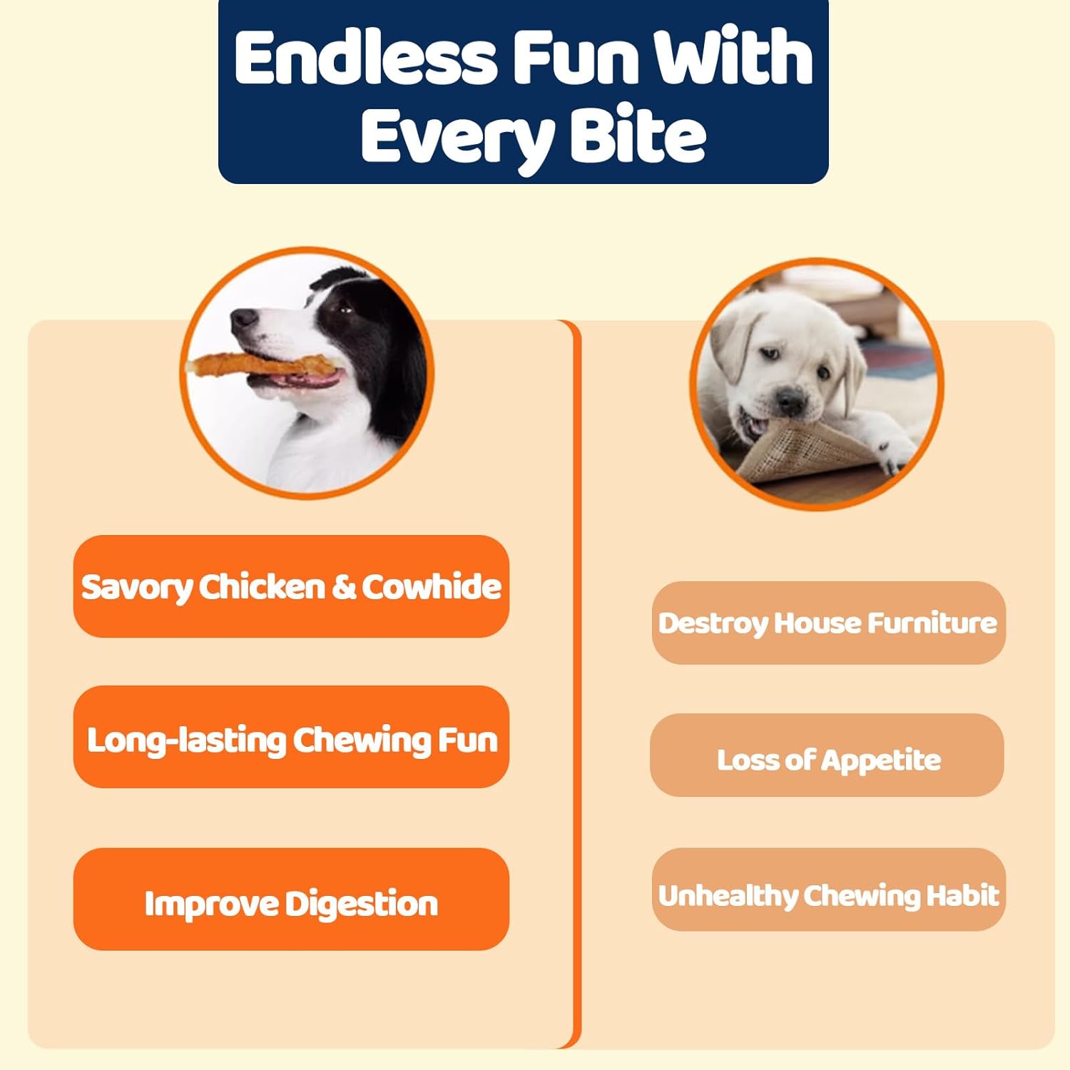 About this item Natural & High-Protein: Made with real chicken breast and natural rawhide. A high-protein, low-fat snack with no artificial colors, flavors, or preservatives. Promotes Dental Health: Helps reduce plaque and tartar buildup through chewing. Supports healthier teeth and gums and satisfies your dog's natural urge to chew. Perfect for All Dogs & Training: The ideal 5-inch size for adult, puppies and small dogs. A flavorful and motivating reward for training or everyday treats. Safe & Digestible: Made under strict guidelines. Carefully roasted for a safe and enjoyable chew that's easy to digest. Fresh & Portable Pack: Comes in a resealable bag to maintain freshness. Easy to take with you for mess-free snacks on the go. › See more product details
