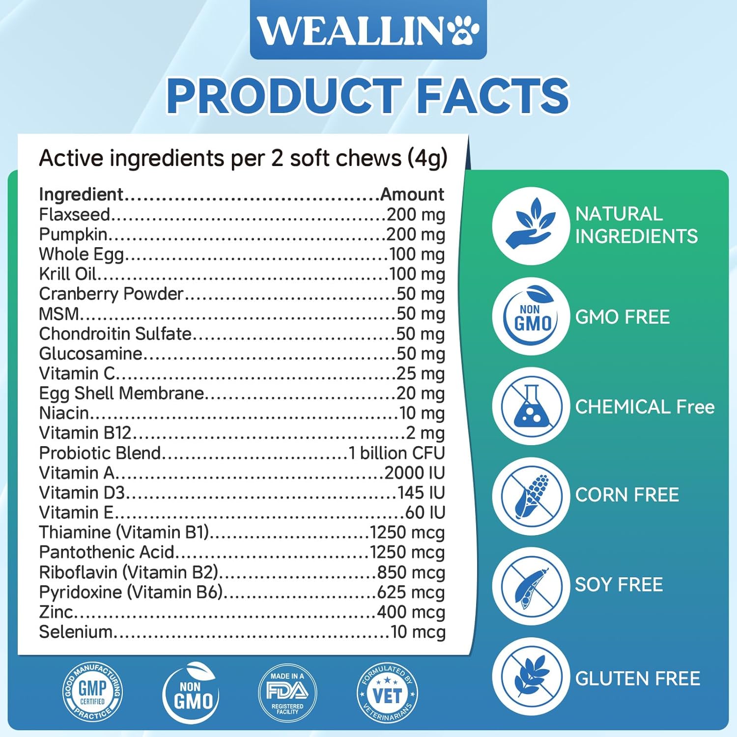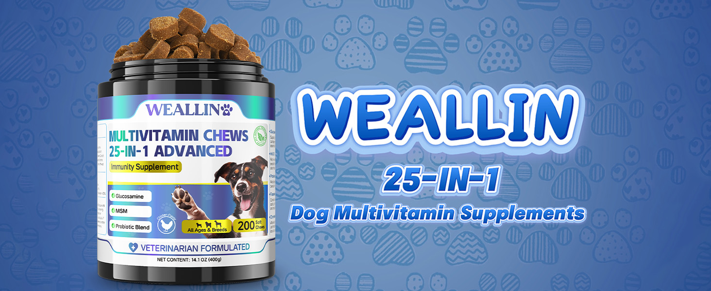 About this item Premium Natural Ingredients: Our dog multivitamin feature premium natural ingredients like glucosamine, MSM, chondroitin, vitamins A-E, krill oil, and probiotics. These powerful ingredients work to build strong bones, boost immunity, maintain skin and coat, and improve digestion and nutrient absorption to keep your dog in tip-top shape while enhancing overall health. Skin & Coat Care: Our dog supplements & vitamins gives your dog the shiny coat they deserve! Our formula includes Omega-3-rich krill oil to promote shiny coat and healthy skin while reducing dandruff and irritation for a happier pup. Boost the Immune System: WEALLIN vitamins for dogs boost your furry friend's defenses! Enriched with natural minerals like vitamins A-E, zinc, and selenium, our dog vitamins multivitamin support a strong immune system to ensure your dog stays healthy and active at all stages of life. Support a Healthy Gut: Our dog vitamin contain ingredients like cranberry powder and probiotics to improve digestion and nutrient absorption. Plus, the delicious chicken flavor ensures your dog enjoys every bite, giving them the energy they need for active play! Striving for Excellence: At WEALLIN, we are committed to protecting your pet's health with the highest quality, purest products to enhance their health and well-being. Our mission is to create comprehensive health solutions that ensure your dog thrives and help them become your most loyal companion. › See more product details