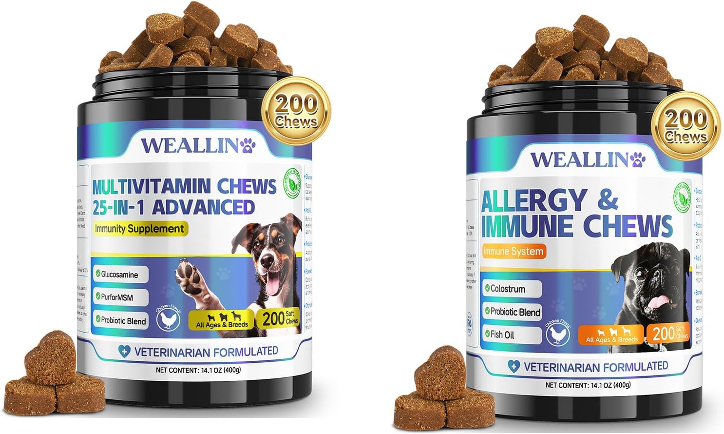 • Everyday Nutritional + Skin Support for Sensitive Dogs Many dogs facing seasonal or skin-related sensitivities also need foundational daily nutrition. WEALLIN’s Daily Vitamin Chews provide essential nutrients for overall wellness, while our Allergy Support Chews offer targeted support for dogs prone to itching or environmental discomfort. Together, they form a well-rounded solution for daily care. Smart support for dogs with skin and nutrition needs in one simple routine.