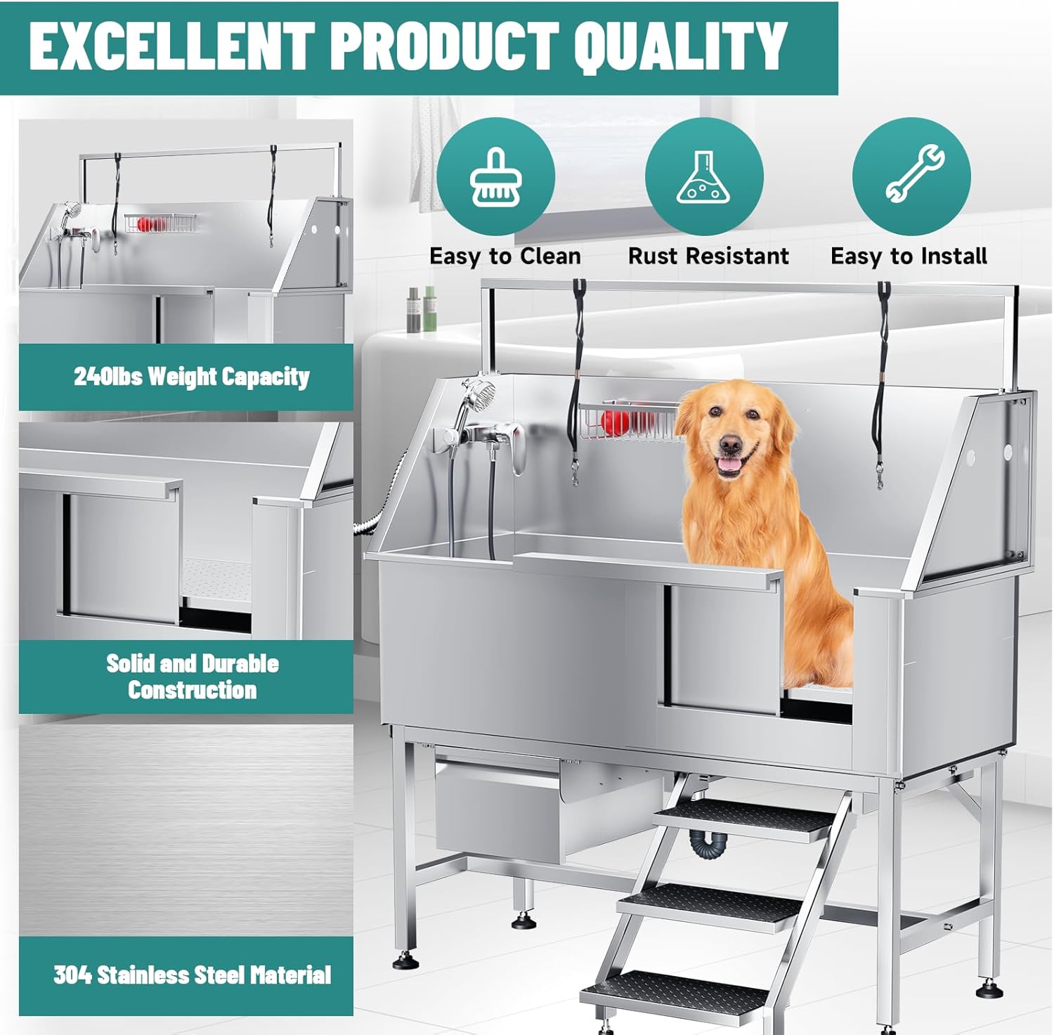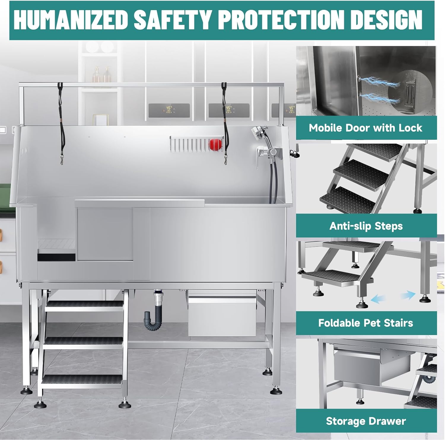The elevated dog washing station features commercial stainless steel, slip-resistant flooring, and a built-in ramp. Its deep basin contains splashes, and the ergonomic height reduces strain. Perfect for home or salon use, this dog bathing station includes leash anchors, an adjustable sprayer, and quick-drain technology. It is the ultimate dog bathtub solution for safety and comfort.