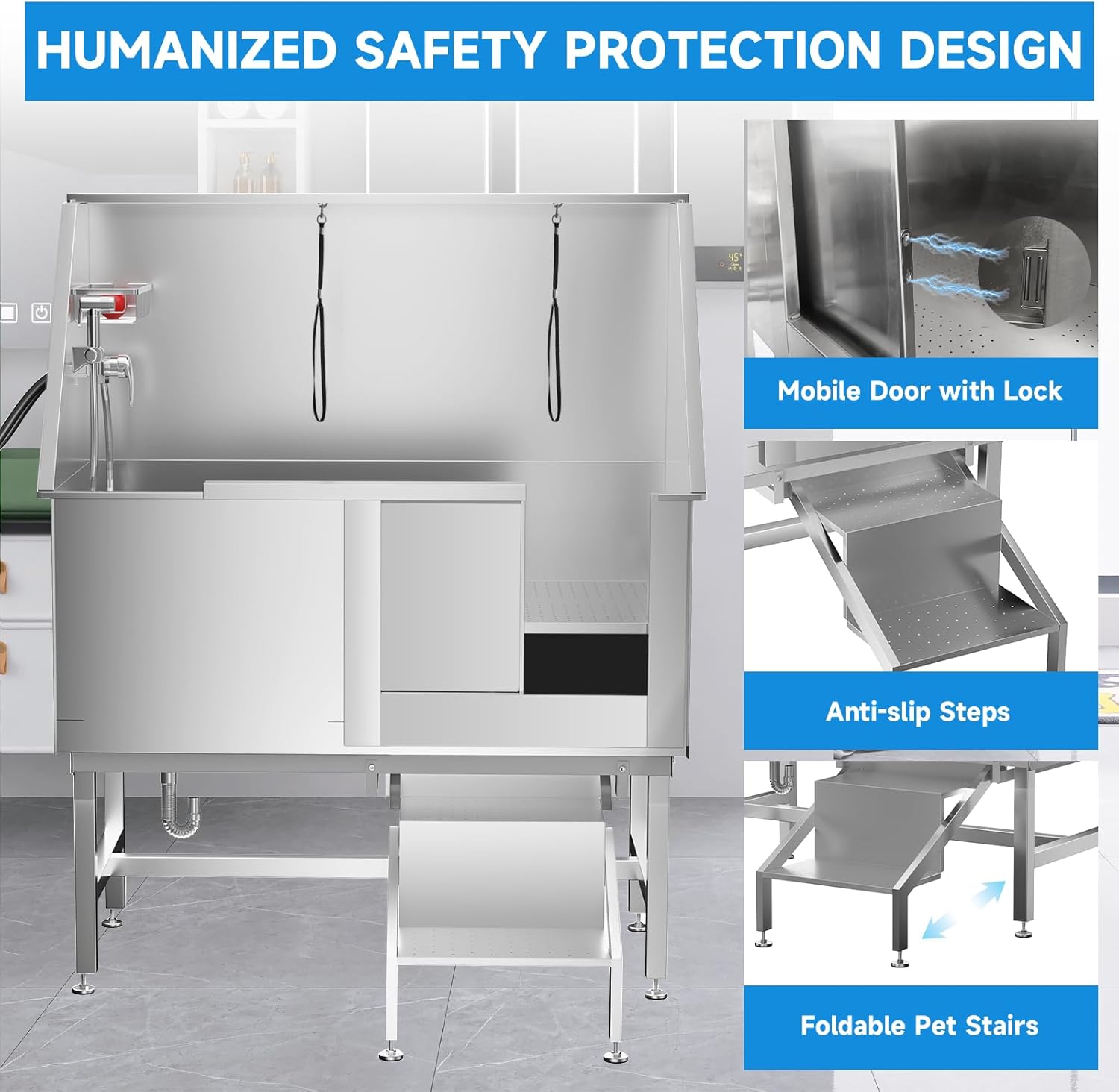 【CONVENIENT DESIGN】Our bath tub for dogs with excellent design quality: ① Sliding storage drawer for neatness and storage. ② Double rubber seal prevents water leakage. ③ Adjustable position of faucet and shower head. ④ Removable Floor Grate. 【HIGH-QUALITY MATERIALS】Our dog tubs for bathing are crafted with precision using durable 304 stainless steel. With an all-in-one design and leak-proof fully welded structure, our pet grooming & wash tub can prevent water leakage and odor backflow. 【SUPER LOAD-BEARING CAPACITY】The Non-Slip Tub Rack offers an elevated, secure, and clean surface for dogs showering, it is installed on heavy-duty stainless steel frames which can hold up to 300lbs. This dog bathtub comes with a large space that can accommodate pets of different sizes 【ANTI-SLIP STAIR & GRID】Our dog wash station can be easy to use while offering security. Pet tub with a pet stair featuring a non-slip texture on the surface, allowing your pets to safety climb and play. 【PROFESSIONAL USE EXPERIENCE】This perfect design grooming tub makes pet grooming easy and safe. Ideal for professional pet groomers and pet lovers. Great for home or pet store use. › See more product details