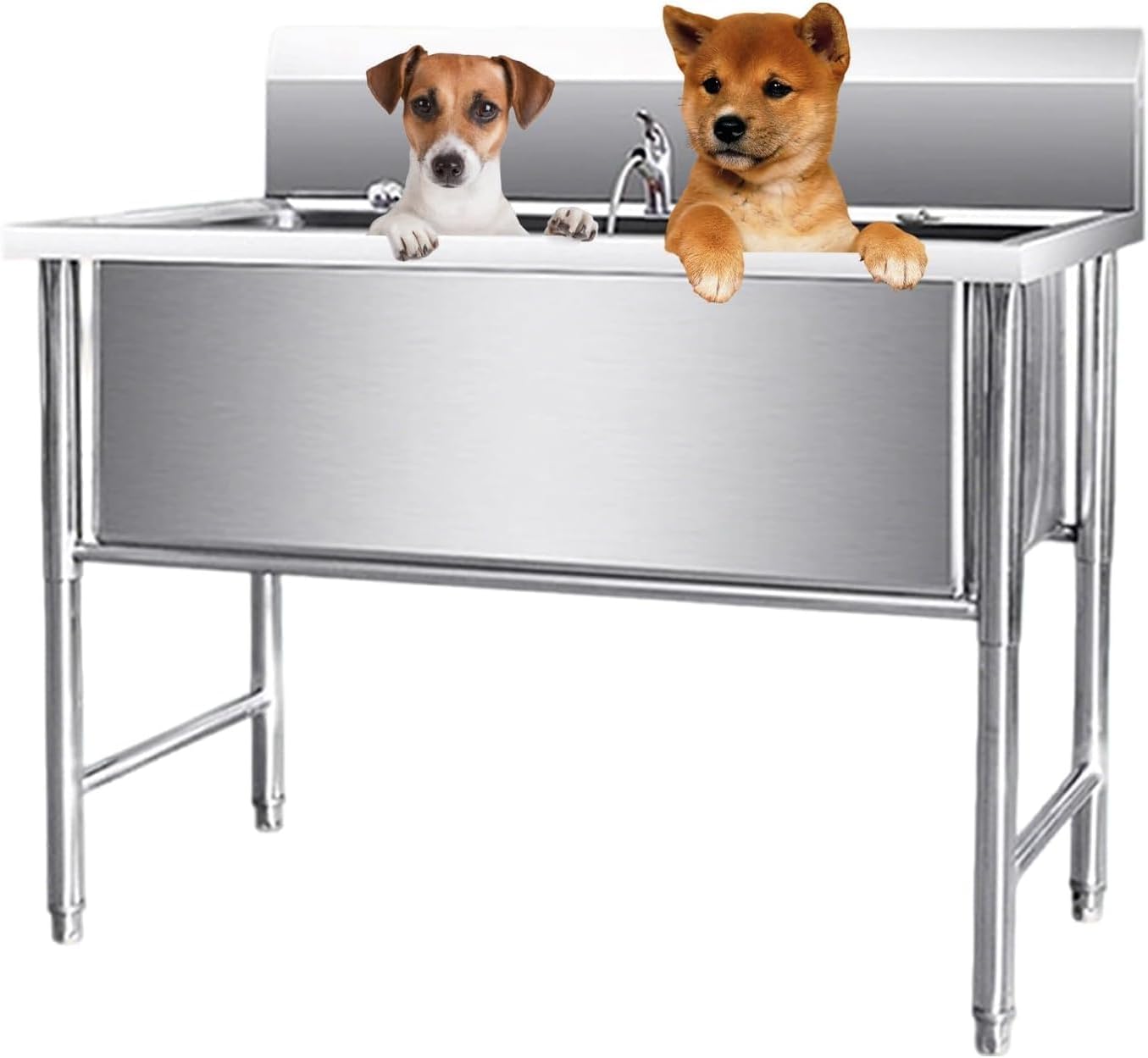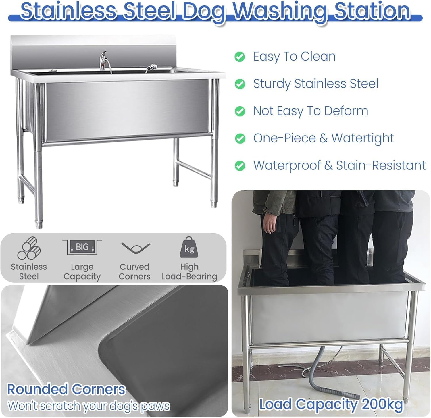- Specification:Material: Stainless Steel Color: Silver Weight Capacity: 200 kgOverall Height: 115 cmWidth: 70 cmDepth: 40 cm, 50 cm- Feature:One-piece design, just install the legs, easy to installStainless steel material, rounded corners will not hurt pets40cm and 50 cm depths allow pets to take a medicated bathDog tether ring can prevent pets from running around during bathingStainless steel drainer can better filter dog hair and debris to avoid cloggingAnti-slip mats can prevent dogs from standing safely during bathing and avoid slippingThe longest faucet can be pulled out to 120 cm, no dead angle to wash the dog, more convenient to use- Package Includes:1 x Dog Washing Station1 x Removable Drain Strainer1 x Drain Pipe1 x Dog Leash Ring1 x Non-slip Mats1 x Waterproof Board1 x Stretch Faucet- Tips:There may be an error of 1-3 cm due to manual measurement.There may be chromatic aberration due to the difference between the recording lamp and the display. Please refer to the actual product.