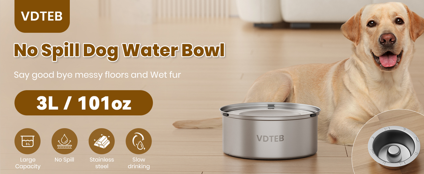 About this item Spill Proof Dog Water Bowl: This dog water bowl no spill s features One-Piece floating disk and silicone plugs on both sides, which can minimize water splashing and keep the floor dry. The no spill water bowl for dogs is perfect for sloppy drinkers Healthy Drinking: The slow drinking dog water bowl adjustable magic float slows down your pet's drinking speed, preventing water from spilling, wet noses, or drippy mouths. A dog slow water bowl is ideal for long-haired and sloppy drinkers Anti-Slip Design: This slow water bowl for dogs is designed with non-slip silicone pads on the bottom to keep the water bowl in place. The silicone pads can increase the friction with the ground, ensuring the stability of the dog water bowl and protecting the floors 1.5 Gallon Large Capacity: The 5.6L large dog water bowl is ideal for medium to large dogs and multi-pet households. This spill proof dog water bowl ensures your pets have sufficient water throughout the day without frequent refills, and makes a great vehicle-carrying travel water bowl for dogs Stainless Steel and Easily Clean: This stainless steel dog water bowl is made of premium 304 stainless steel, with rust-proof features. The dog slow water bowl is hand washable and dishwasher safe, easy to clean, and saves your precious time. › See more product details