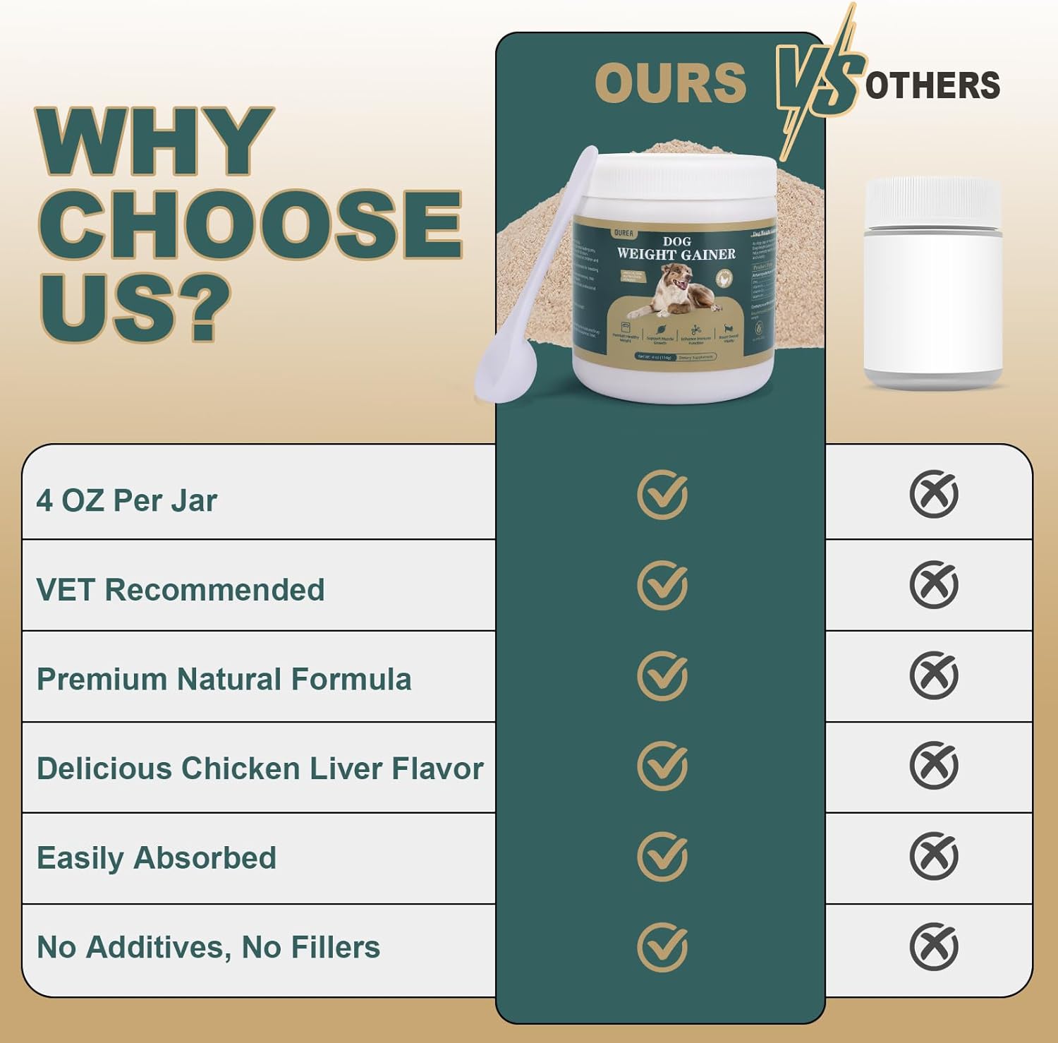 Designed for Senior Dogs - As they age, dogs' bodies gradually change: metabolism slows, muscle loss, and appetite deteriorates, all of which can lead to weight loss, malnutrition, and lack of energy. OUREA dog weight gainer is designed specifically for aging dogs. It helps supplement and maintain a healthy weight, support muscle mass, and increase physical strength, allowing senior dogs to regain their energy every day! Senior Dog Weight Gain Supplement - Designed to help senior dogs maintain a healthy weight and preserve muscle mass, the dog weight gain makes it easier for them to go about their daily lives. It also provides essential daily nutritional support to help maintain immune system function and overall health. Perfect for senior dogs who are underweight, low on energy, or recovering from an illness, it helps them stay active, comfortable, and healthy well into their golden years. High-calorie Nutritional Powder - This dog weight gainer uses a scientific ratio to combine key nutrients such as zinc and multivitamins to help elderly dogs maintain a healthy weight. The weight gain formula is specially added with egg yolk powder, whole goat milk powder and zinc gluconate, which is rich in high-quality protein and natural nutrients, which not only improves palatability, but also helps maintain muscle condition and daily vitality. Veterinary Formula - This veterinarian-recommended dog weight gain is a premium, all-natural formula specifically formulated to support muscle mass in older dogs. With no additives or fillers, the pure ingredients are safe and reliable, so you can be confident that you are providing your furry friend with the nutritional support he needs every day. The high calorie dog supplements is easily absorbed, helping your dog make better use of every nutrient, making supplementation more effective. Easy to Feed - This dog weight gain powder comes in powder form and can be easily mixed into your dog's daily diet. It uses a delicious chicken liver flavor, which is highly palatable and is especially suitable for older dogs with poor appetite or picky eaters. Each can comes with a 1 gram measuring scoop for precise feeding control. It is recommended to feed 1 gram per 4.5 pounds (about 2 kg) of body weight per day to meet the daily nutritional supplement needs of older dogs of different sizes. βΊ See more product details