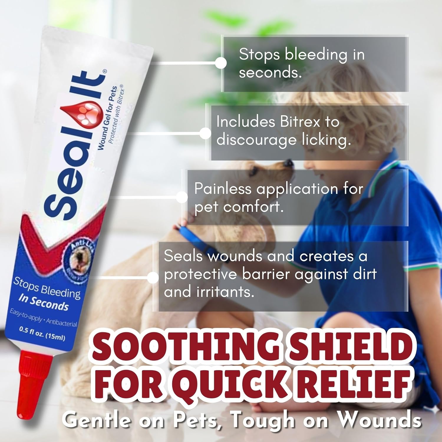 - Directions: Clean the wound using Wash-It Wound Cleanser. Spray directly to flush out dirt—no rinsing needed., Done! The gel seals the wound, stops bleeding, and discourages licking for faster healing., Seal the area with Seal It Wound Gel. Apply directly and press gently with gauze for 30–60 seconds.