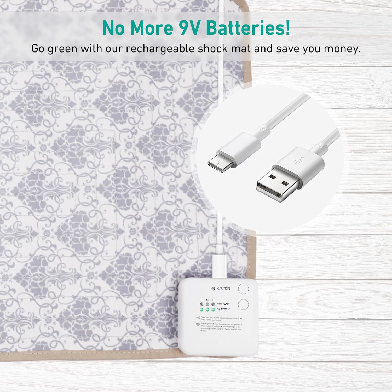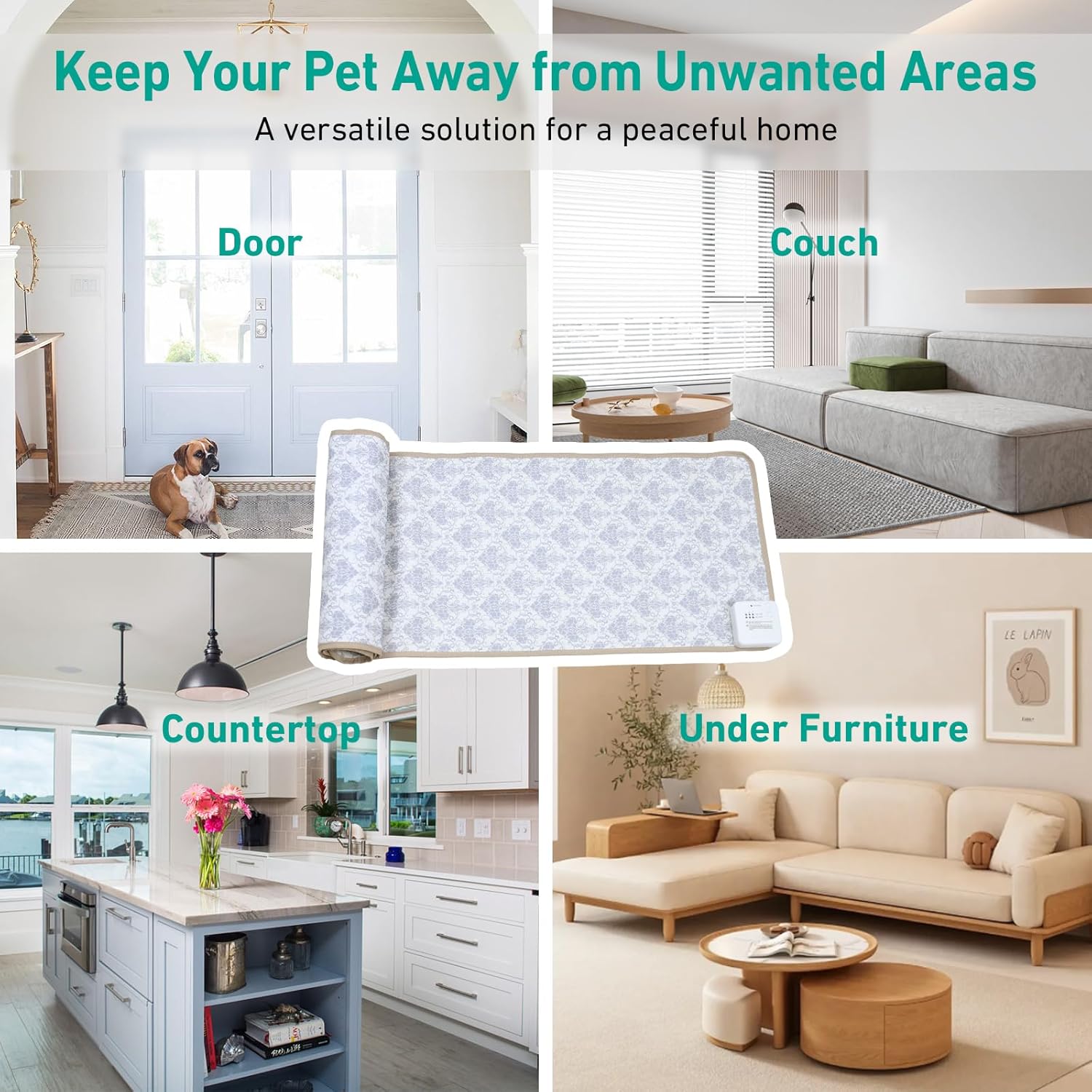 About this item Safe and Effective - The DOGNESS Pet Shock Mat is designed to keep your pets off furniture, counters, and other areas you want to protect. The wires on the mat trigger a harmless static pulse that trains your pets to stay away. 3 Training Modes - Suitable for all sizes cats and dogs, this pet repellent mat offers low, medium, and high voltage modes for effective behavior training and correction. Easy to Use - The DOGNESS Pet Shock Mat is simple to use with only 2 buttons, powered by a rechargeable battery, and features auto-deactivation after five consecutive shocks to avoid overuse. Tested and Proven - The Dogness shock mat comes with a test pen, allowing you to easily verify its proper functionality and eliminating the need for users to test the mat with their palm. Other features - Rechargeable, Battery life indicator, Mat washable (Note: Battery compartment is not washable) › See more product details