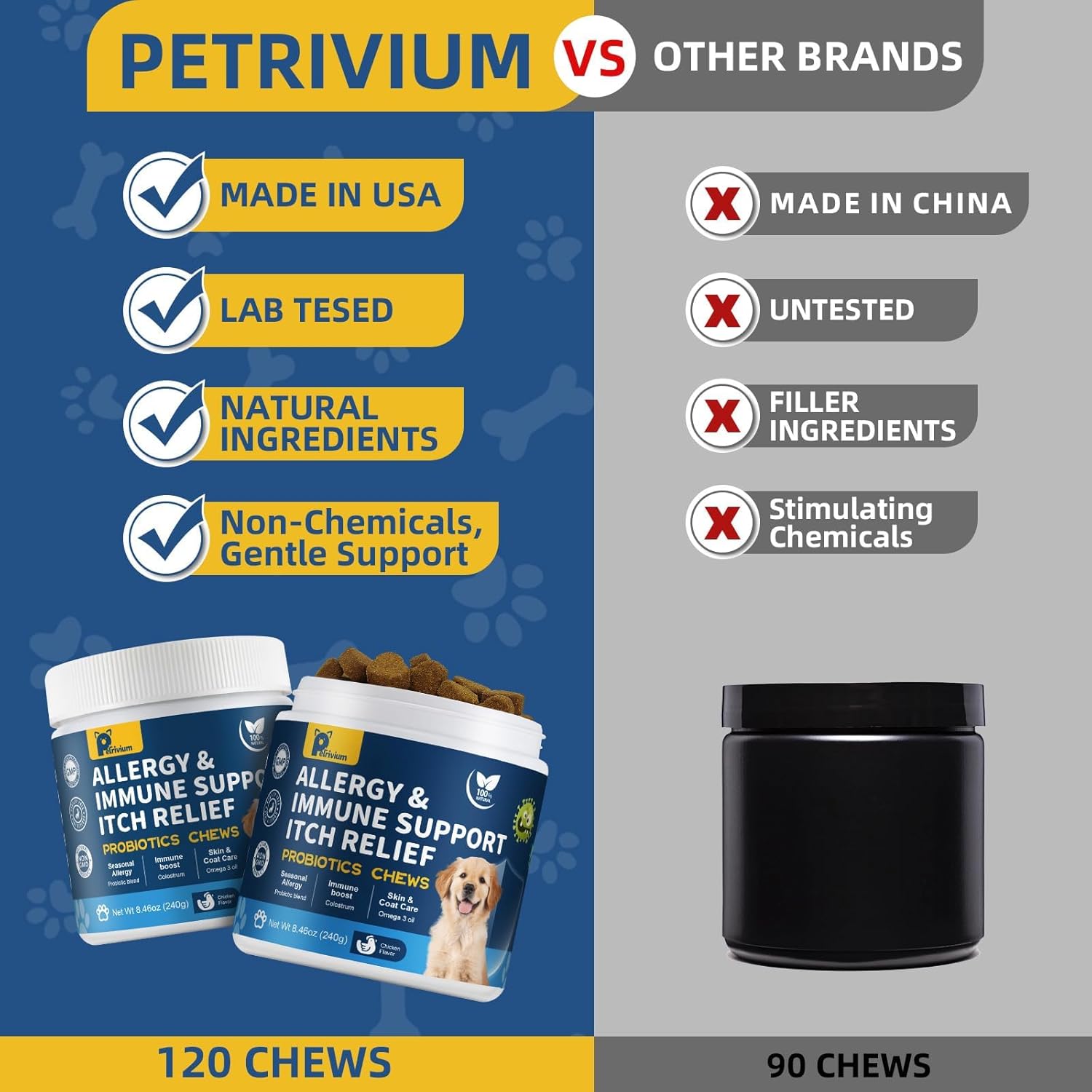 About this item 【Provides Allergy Relief For Dogs】Our new formula dog allergy supplement Contains Colostrum and Astragalus Root and offer fast dog allergy relief and itch relief for dogs.Supports a natural histamine response which Meaning less itching, sneezing, and scratching for your pup. Ideal for allergy relief, itchy skin relief, and the best itchy skin relief for dogs. 【Effective Itch Relief】These allergy chews for dogs targeted itch relief for dogs from paws to belly to ears. It calms dog itching skin relief and irritated areas, providing long-lasting comfort. Ideal for dog itchy skin relief, itchy skin relief, and supporting dog yeast infection treatment and yeast infection treatment for dogs, keeping your dog's skin comfortable. 【Stronger Immune System】These allergy chews designed to help your dog both environmental and food allergies. They feature EpiCor Pets, a whole food yeast fermentate, coconut oil for dogs, dog fish oil, vitamin e, colostrum, & turmeric, that combine together to give your dog a stronger immune system and potent allergy relief for healthy responses. 【Probiotics+Omega 3】Supports Digestive, Immune & Skin Health, Formulated with 5 strain probiotics like Lactobacillus acidophilus to maintain normal gut flora and Omega-3 fatty acids EPA & DHA to promote healthy digestion, strengthen immunity, and provide skin and itch relief for dogs. 【Formulated for All Dogs】Created with every dog in mind to win over even the pickiest eaters, our probiotic chews for dogs are perfect for all ages and sizes - from playful puppies to wise seniors - Their irresistible flavor and texture make daily digestive support easy and enjoyable, supporting gut and digestive health. 【Buy with Confidence 】— If you or your pet aren’t completely satisfied with the results, we’ve got you covered. If you have any issues with the product, simply contact us via Amazon Message Center. You’ll Enjoy a full refund, no questions asked! › See more product details