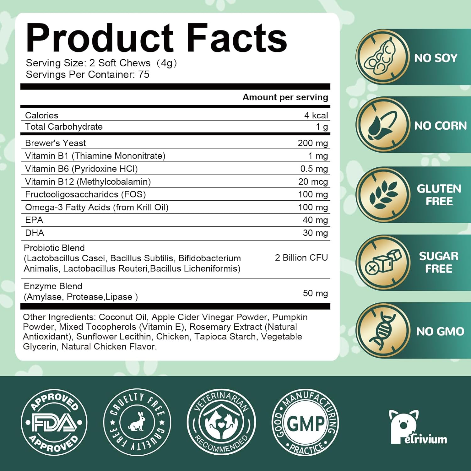 About this item Natural Flea & Tick Support for Dogs - A balanced blend of natural essentials that help support skin, coat, and immune health—creating a less attractive environment for fleas and ticks and discouraging them from laying eggs on your dog’s coat, while keeping your pet in a happy and comfortable state and helping provide longer-lasting protection from fleas and ticks. Daily Defense + Skin & Coat Care - This flea & tick prevention supplement is made with pure, natural ingredients that are safe and effective. Formulated with flaxseed, neem, and rosemary to help naturally repel fleas and ticks when used daily. These chews also provide additional nutritional support with a Vitamin B blend, probiotics blend, and Omega-3 for healthier skin and a shinier coat. Comprehensive Support for dogs - Provides comprehensive support with a chewable flea and tick supplement that helps boost daily immunity against seasonal pests. These chews help discourage fleas and ticks while also supporting healthy skin. Formulated to strengthen the body’s natural defenses from within, offering dogs added support in various outdoor environments. No Harsh Chemicals Add - Crafted with clean, science-backed ingredients as a natural alternative to synthetic pesticides, this gentle daily supplement being safe for all breeds and life stages. Free from synthetic pesticides and harsh additives, it’s ideal for long-term use and provides a worry-free way to maintain a healthy, shiny coat. Delicious Chicken-Flavored Chews - Made with a tasty chicken flavor that dogs can’t resist, these chews are a flavorful alternative to pills or tablets. Even picky eaters will happily enjoy them, making it easy to provide daily support. Your Puppies will look forward to each bite as a snack-like treat while getting the benefits they need. Buy with Confidence - If you or your pet aren’t completely satisfied with the results, we’ve got you covered. If you have any issues with the product, simply contact us via Amazon Message Center. You’ll Enjoy a full refund, no questions asked! › See more product details