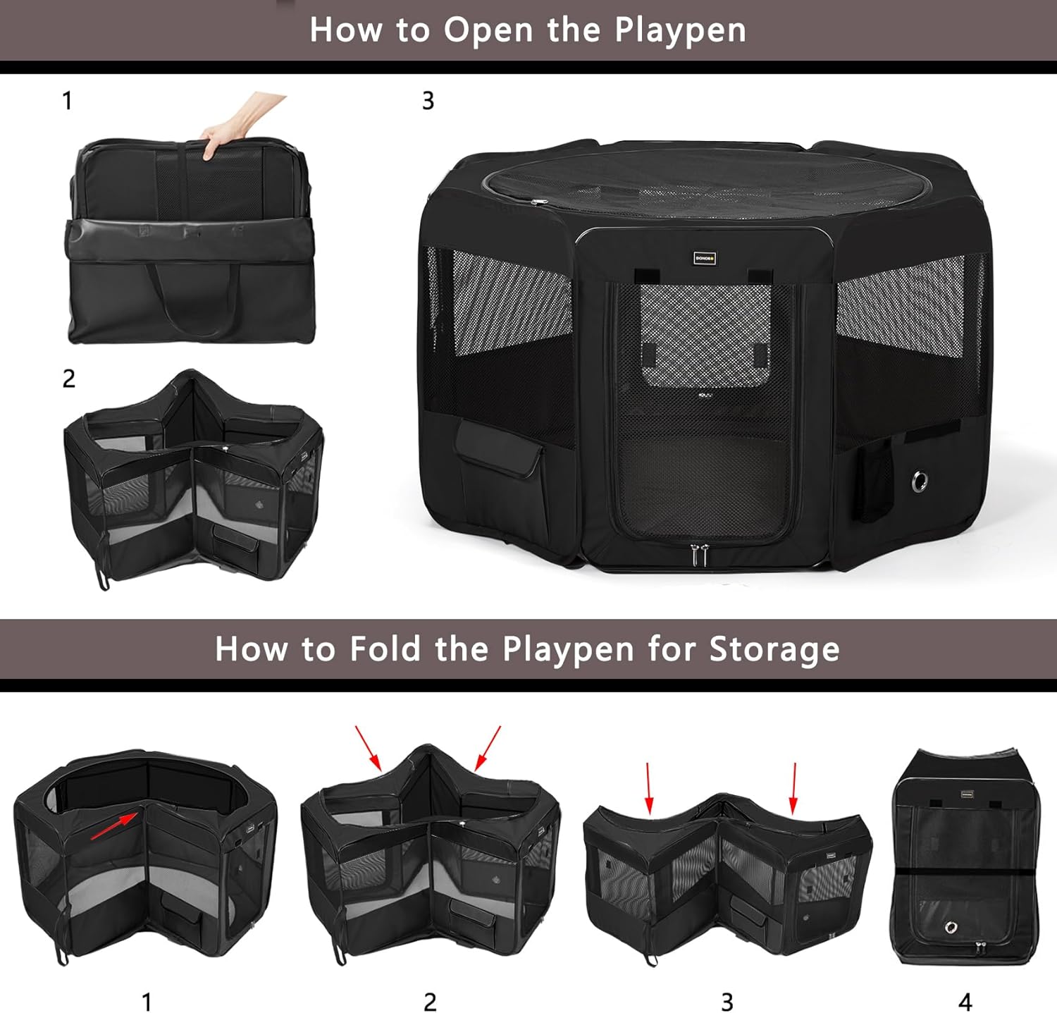 About this item 【EASY TO SET UP & CARRY】Portable Dog playpen with carrying case is ideal for indoor and outdoor use. Sets up in seconds and requires no assembly, folds flat when not in use for easy carrying and storing. 【DIMENSIONS】 Playpen Size: 46”(Diameter) x 23" (Height); Panel Size: 15-1/2" W x 23" H; Door Size: 13" W x 17" H; Mesh Cover Diameter: 34-1/2". (Manual measurements, please allow +/- 2cm difference!!!)Roomy 8-Panel design dog exercise pen with removable zippered top and bottom, washable 600D Oxford fabric and mesh panels make the cleaning easier. Spacious interior gives your pet room to play in the pen. 【QUALITY MATERIAL】Cat playpen with protected seams and reinforced corners ensure your pet's safety. Made from durable quality & water-resistant materials makes it a great play pen for small and meduim dogs. 【DURABLE & SAFETY】Two doors with locking zippers for safety and security: removed for indoor use & closed for outdoor use. There are also two accessory pockets, a water bottle pocket and holder on the kitten playpen. 【MORE OCCASIONS】Lightweight but strong, makes this animal playpen ideal for traveling, camping, suitable for cats, rabbits, kitten, bunny and so on. 【QUALITY GUARANTEE】1-Year Manufacturer's Warranty on dog kennel. Please contact seller if you have any questions. › See more product details