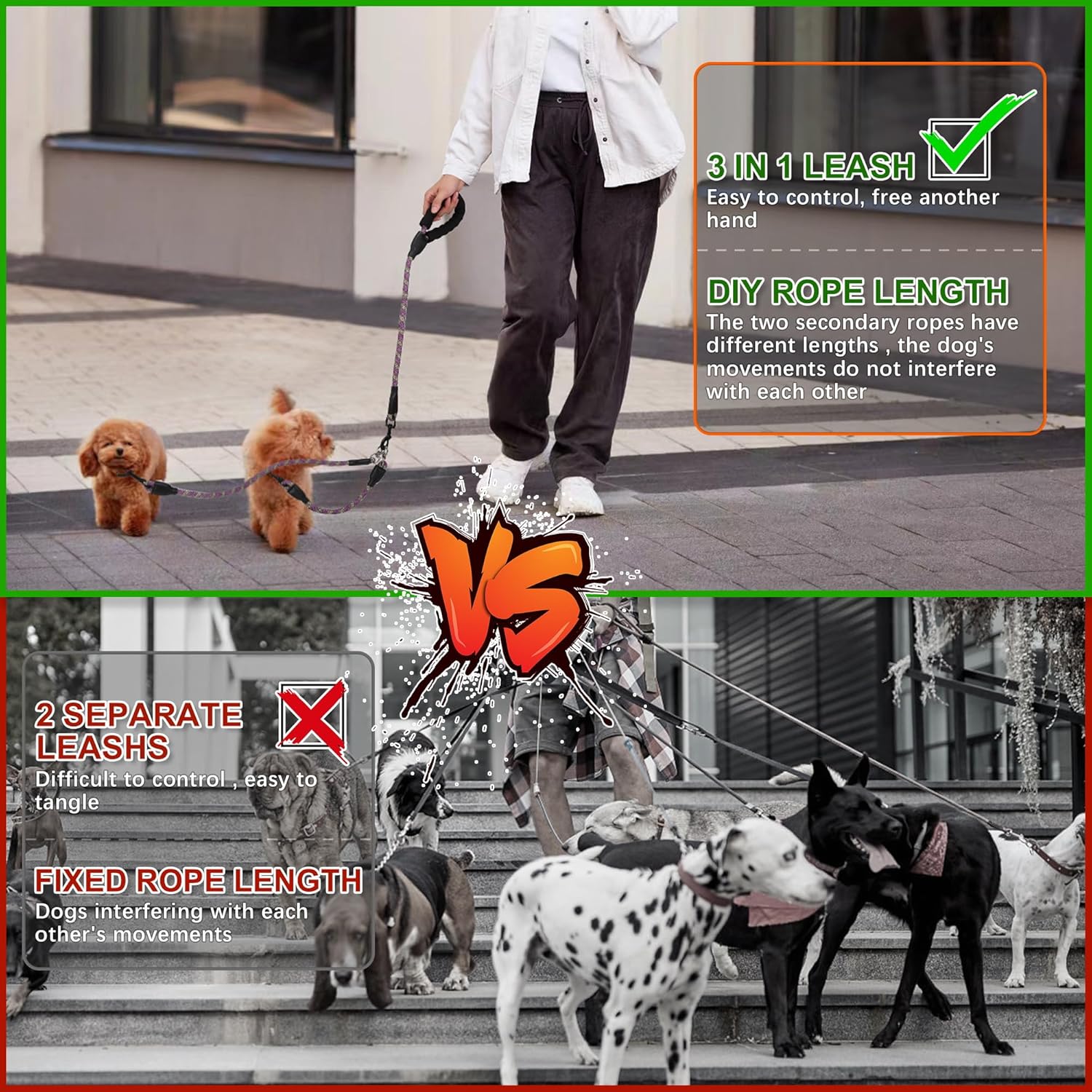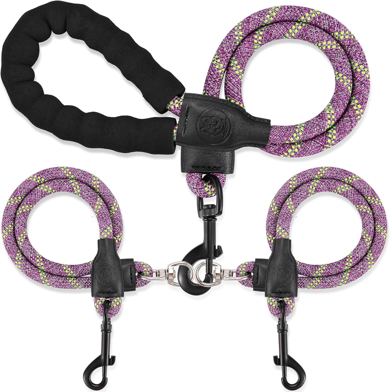About this item 2 Dog Leash Size: 31 inch main leash + double auxiliary leash(Each long 28 inch) Durable material design: The hardware is all metal, While climbing rope are made of durable nylon. Mengbei tribe dog leash more durable but lightweight,Easy to clean. Each individual traction belt is durable,Solid but has shock absorbing No Tangle design: 360°Swivel coupler and splitter it is perfect to avoid tangle, And the two alloy swivel snap is attached on each of the elastic strap, Allows for auto adjusting when dual dog leash criss cross,No limtation for your dogs while moving from side to side without messing the leash Sponge Handle Design: Our dog leash comes with soft padded handle, Comfortable grip Will never hurt your arm and protects your hand from rope burn. Free up one of your hands and control both dogs with one leash, Life is easy Reflective Stripe Design: Benefit extra safety at night from the reflective stitching Across the entire dog leashes, Ensure you and your dogs' safety at night walking in a poorly lit environmen › See more product details