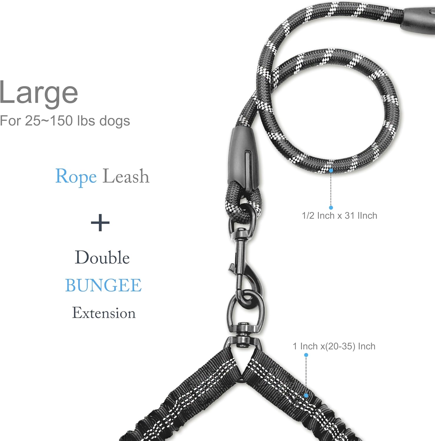 About this item ♥Comprehensive Durability Tests -- Through multiple tensile tests and wear resistance tests simulating real usage scenarios, double dog leash for two dogs is ensured that each product can exceed the expectations of dog owners and is durable. This double dog leash redefines the new way of dog walking with its excellent durability, convenient operation experience, considerate safety design, and humanized comfortable grip. 𝐒𝐏𝐄𝐂𝐈𝐀𝐋 𝐍𝐎𝐓𝐄: Double dog leash are not suitable for small dogs. ♥Convenient Operation, Dual Enjoyment -- The buckle-type quick adjustment enables 2 dog's owners to adjust the rope length anytime and anywhere according to the environment. Whether walking through busy streets or strolling in the vast fields, double leash for two dogs can be handled with ease. The specially designed two non-interfering elastic dog leash are specially designed for leading two dogs simultaneously. Even beloved dog with large personality differences can walk together harmoniously. ♥Sponge Handle -- The central handle of dog leash for 2 dogs is wrapped with high-quality sponge, which is soft and comfortable, and does not cause fatigue when held for a long time. At the same time, the anti-slip design of double dog leash for two dogs ensures a stable grip even in a humid environment. The innovatively designed 360-degree rotatable central connector reduces rope entanglement and knotting, making the dog-walking process more smooth and unobstructed using dog leash for 2 dogs. ♥Reflective Stripe Embedded Design -- High-brightness reflective stripes of double dog leash for two dogs are ingeniously embedded around the dogs leash body, effectively improving visibility when walking the 2 dogs at night, protecting the safety of dogs and owners, and avoiding accidents. Choosing dual dog leash means choosing a safer, more convenient, more comfortable dog-walking companion, making every trip a wonderful enjoyment using double leash. ♥Super Tough Material -- Select ultra-high strength, tear-resistant nylon and polyester fiber materials, which are woven through a special process to ensure that the dog leash remains tough and unbroken under extreme pulling and remains as new after long-term use. The connection clasps between the two dog leashes and the climbing main rope are reinforced with alloy materials and precise welding technology, easily coping with large dogs and sudden strong pulls, doubling the safety factor. › See more product details