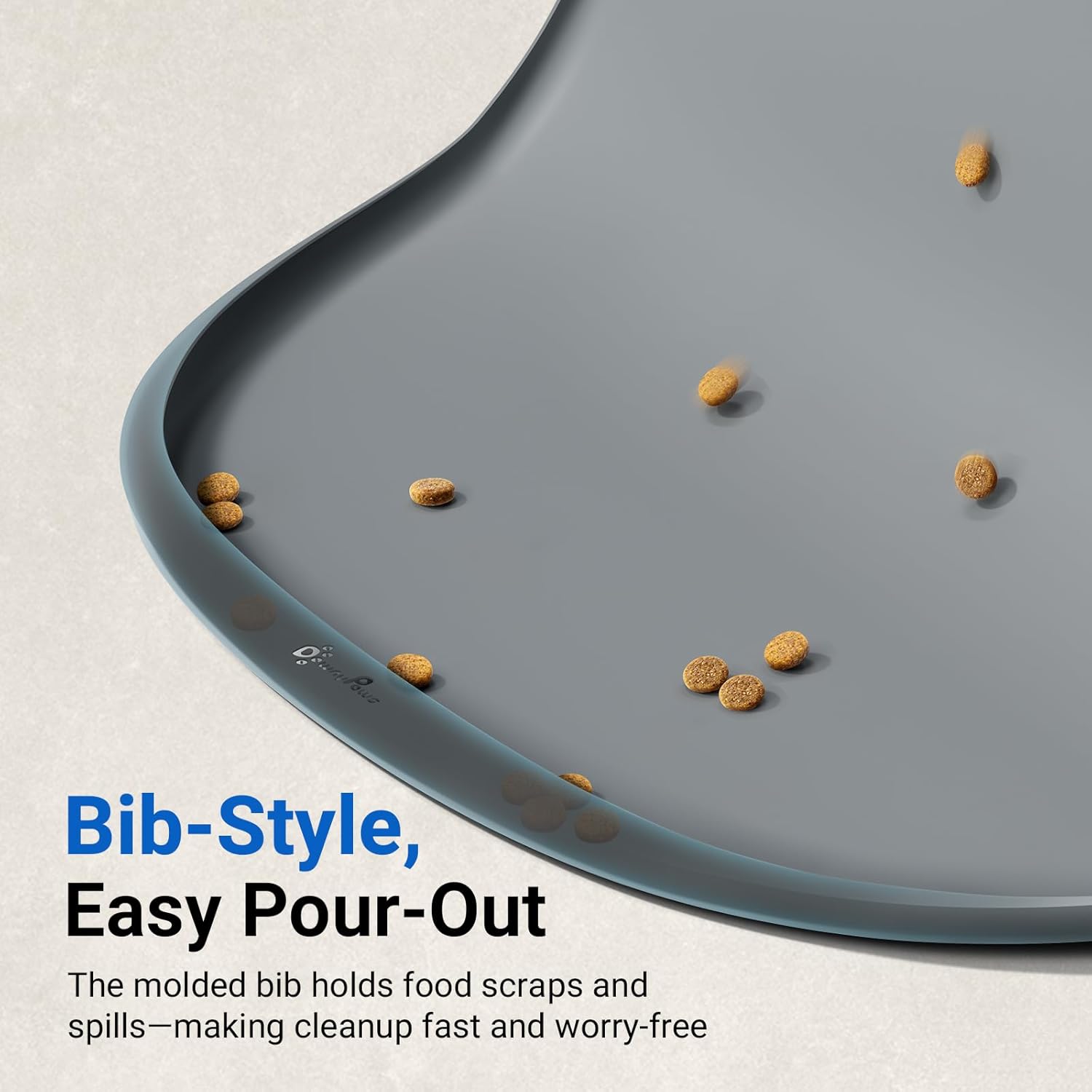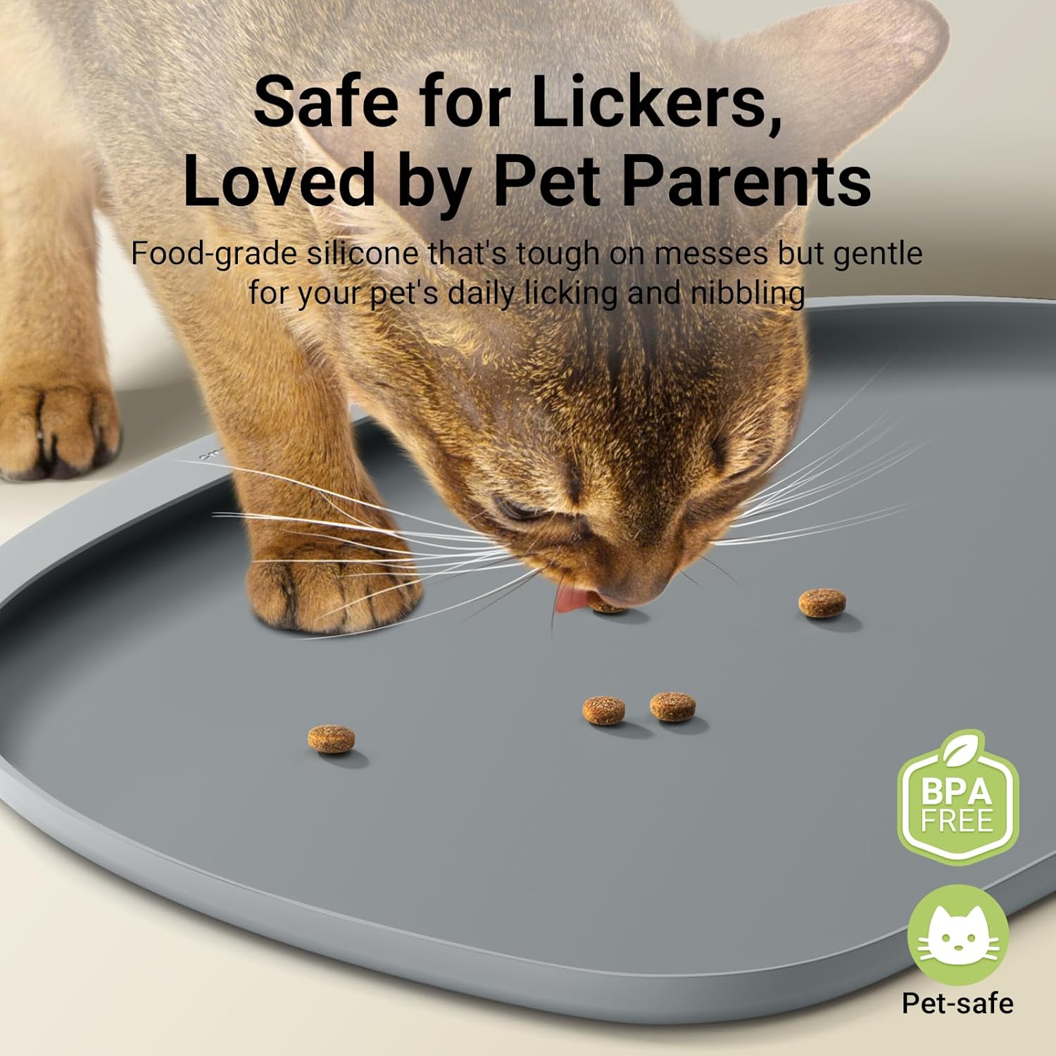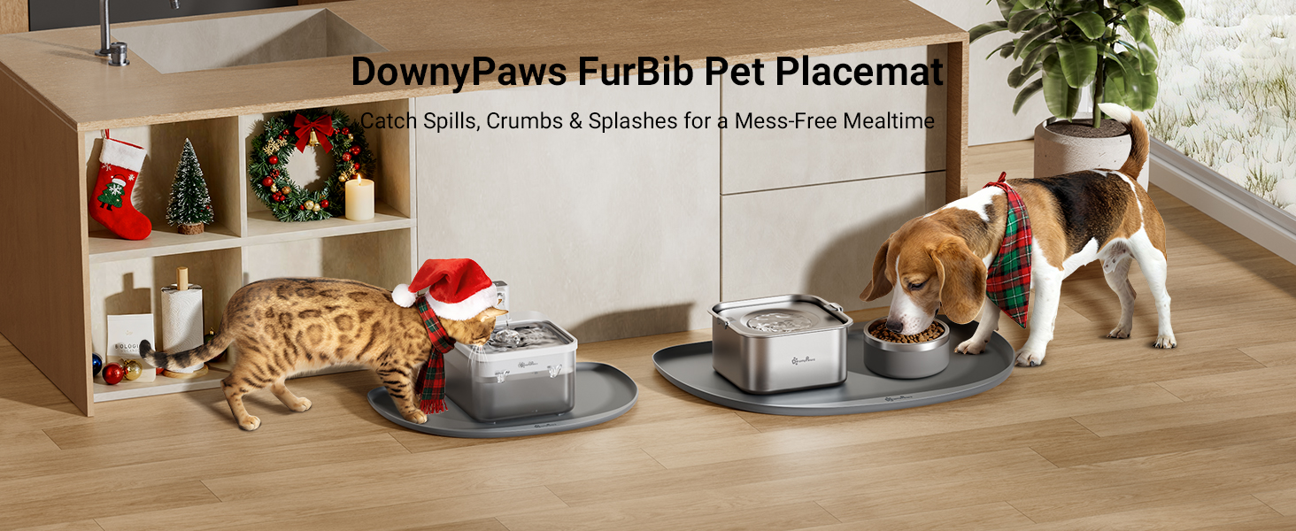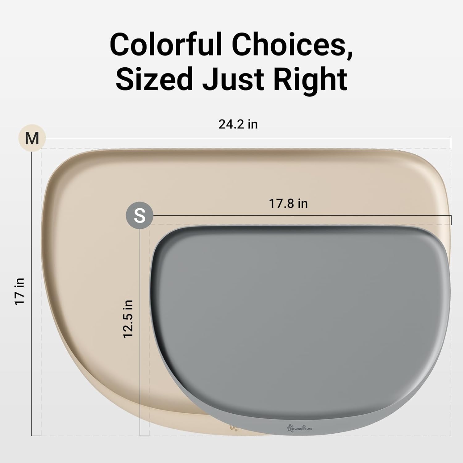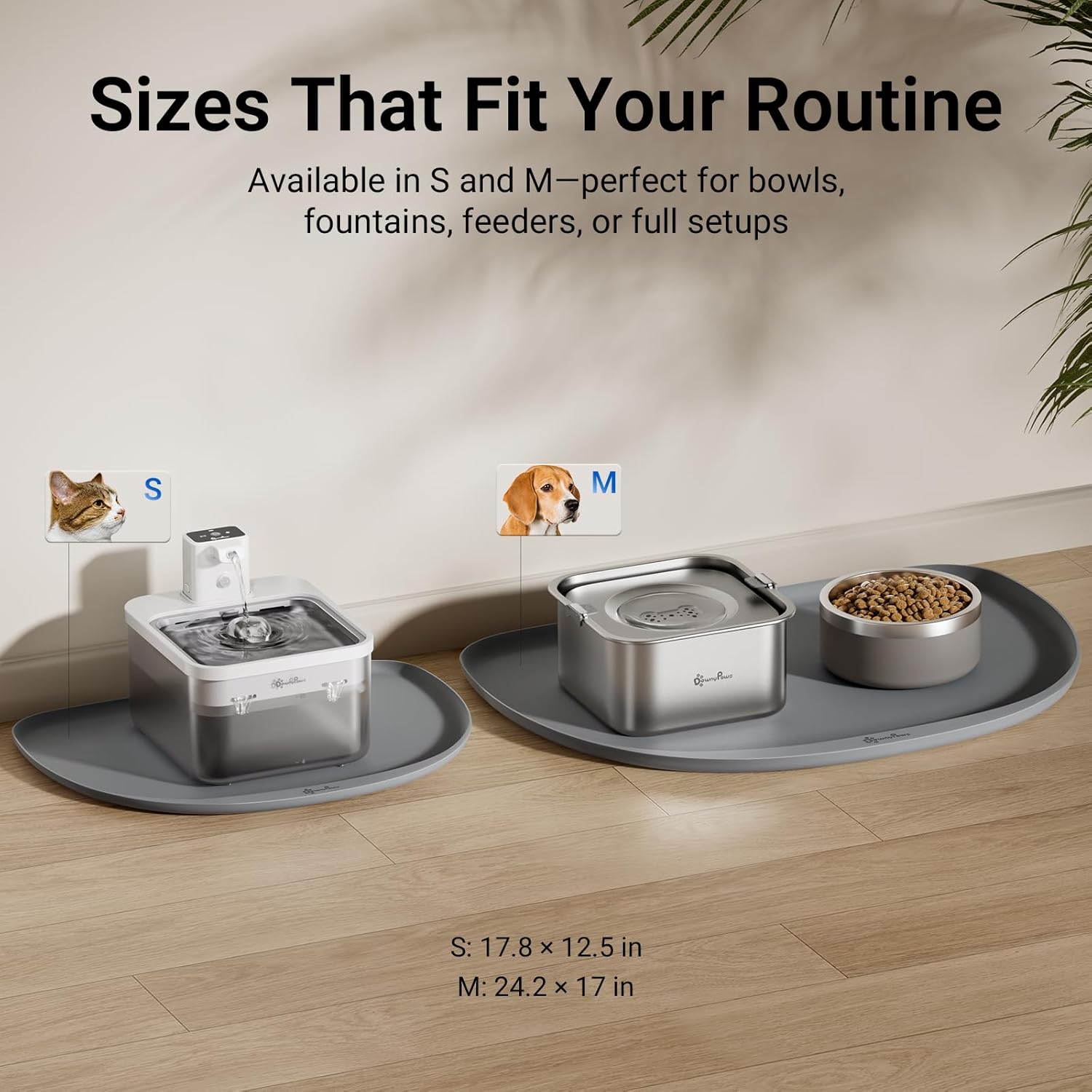About this item Pure Safety for Your Pets: Crafted from food-grade silicone, the dog mat for food and water is BPA-free and safe for curious noses and tongues. Feed with total peace of mind knowing only safe materials touch your pet Stop Messes, Start Happy Mealtimes: Designed with a 0.55 inch high rim around all sides, the pet food mat keeps spills, water splashes, and food crumbs securely contained. The dog water mat keeps floors dry and giving messy eaters freedom to enjoy food Unique FurBib Design: Our thoughtful FurBib design helps guide water and crumbs back onto the pet feeding mat when lifted. Less scatter, less cleanup. The small pocket (10mm deep) suits most cat food sizes, while the medium pocket (16mm deep) easily contains common dog kibble Meals Stay Put: This mat for dog food and water bowls is made from non-slip silicone, keeping your pet's mealtime in place. The cat feeding mat is completely waterproof, keeping every drop in place, so your floors stay clean and dry Available in Two Sizes: Choose from two size options to suit your space and feeding setup. Sized to fit DownyPaws fountains or dog water bowl perfectly, while also compatible with most pet food and water bowls or feeder. (S: 17.8×12.5×0.6 in, M: 24.2×17×0.8 in) Flexible Design for Easy Storage: The soft silicone folds in seconds. With the included silicone strap, the dog water bowl mat stores neatly in any drawer or travel bag, keeping your space calm and clutter-free Dishwasher Safe: Easily maintain cleanliness with a simple wipe after each meal. For more thorough cleaning, you can wash them in the dishwasher or rinse them off with water and air dry them › See more product details