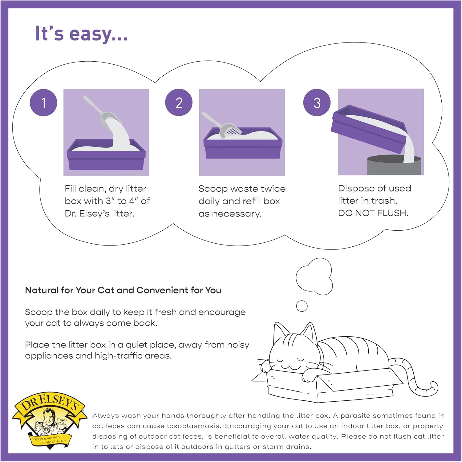 - Directions: Fill clean, dry litter box with 3" to 4" of Dr. Elsey's litter. Scoop waste twice daily and refill box as necessary. Replace entire box once a month. Dispose of used litter in trash. DO NOT FLUSH.