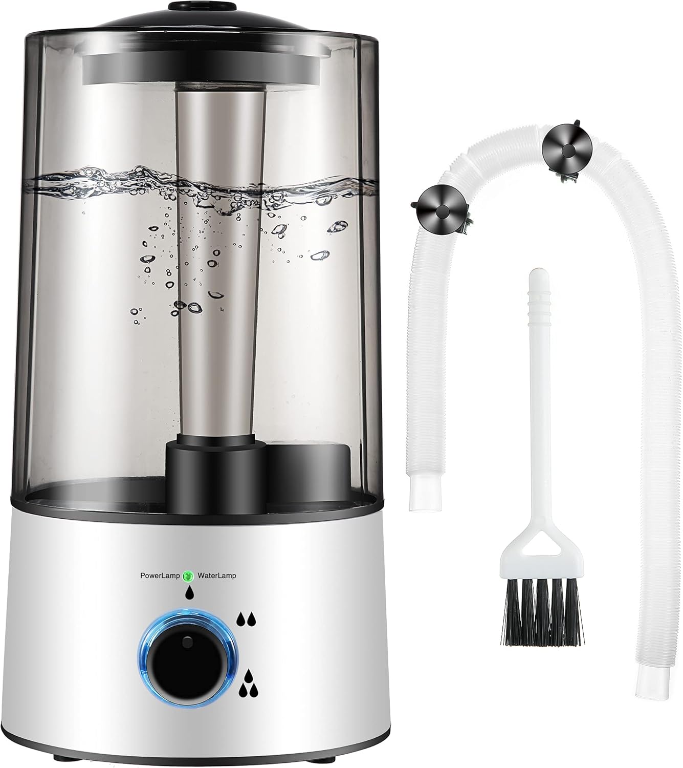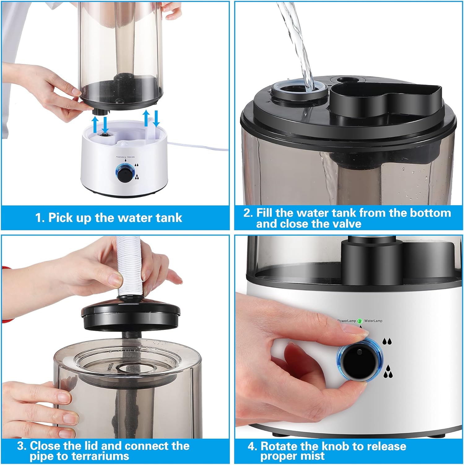 About this item 1 Year: the reptile humidifier provides 180 days ; Due to the long transportation time, please carefully check whether the water tank is in good condition after receiving the package; If there is any damage or any trace of cracks, please contact us via email on the after sales card, we will reply you within 24 hours Humidifying fogger: the size of this reptile humidifier is 33.2 x 15.5 x 15.5 cm, including an adjustable (40-190 cm) length shrink hose and 2 suction feet for fixing the hose; Fog machine can hold 4L-water tank, with visual water level design, and it shuts off automatically when there is no water Adjustable fog output: fogger terrarium has a rotary button on the front, allowing you to adjust the output capacity of fog at will; There is a switch on the back; Remember to turn it on when you use it; Ultrasonic atomization technology, large output capacity, even humidification, high efficiency, energy saving Safe and quite: dry protection device automatically closes the device, so that water tank is safe and reliable when empty; Humidifying fogger has a very low fog sound and can work continuously; When the water in the tank is dry, the indicator light of the machine changes from green to red and fog machine stops working automatically, providing a comfortable and quiet environment for your reptiles and amphibians Suit for: the reptile humidifier with humidity control is designed for reptiles and amphibians that require humidity, including geckos, snakes (pythons, pythons, etc.), iguanas, lizards, chameleons, frogs, turtles, toads, or hermit, crabs and other tank animals › See more product details