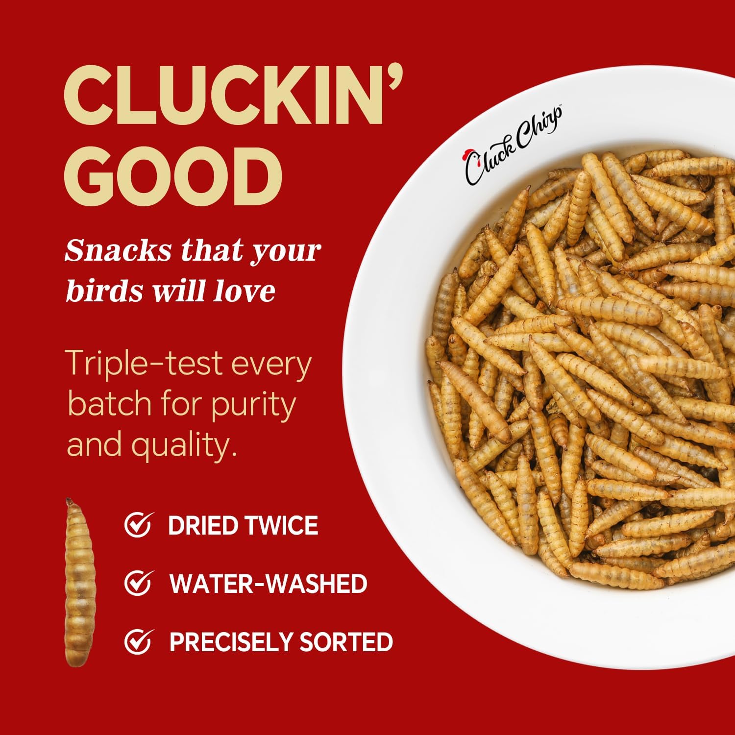 About this item HIGH PROTEIN & CALCIUM BOOST: Our dried black soldier fly larvae (BSFL) are packed with 40–45% protein and over 3% bioavailable calcium—making them the ultimate high-protein treat for chickens, ducks, and backyard poultry. Support strong eggshells, steady egg production, and healthy muscle growth—naturally IMMUNE & FEATHER SUPPORT: Rich in essential fats, amino acids, and nutrients, these BSFL chicken treats promote immune strength, smooth digestion, and glossy feathers. Ideal during molting season, weather stress, or as daily support to keep your flock thriving from beak to tail 100% NATURAL & NON-GMO: No fillers. No preservatives. No artificial nonsense. Just pure, non-GMO black soldier fly larvae—gently dried and triple-tested for safety and freshness. Clean, wholesome nutrition you can feed with pride IRRESISTIBLE FLAVOR THEY LOVE: Naturally savory and satisfyingly crunchy, these chicken snacks activate your flock’s natural foraging instincts. Scatter in the run or hand-feed for bonding time—watch your feathered friends cluck and chirp with joy, beaks racing to peck up every last bite FARM-FRESH & FLOCK-APPROVED: Our sturdy, shelf-stable box and resealable inner bag keep your BSFL fresh, clean, and easy to serve—with every scoop delivering reliable quality you and your flock can count on. Backed by Cluck Chirp’s promise of premium nutrition and happy birds Contains: One (1) 5-lb. box of Cluck Chirp Dried Black Soldier Fly Larvae › See more product details
