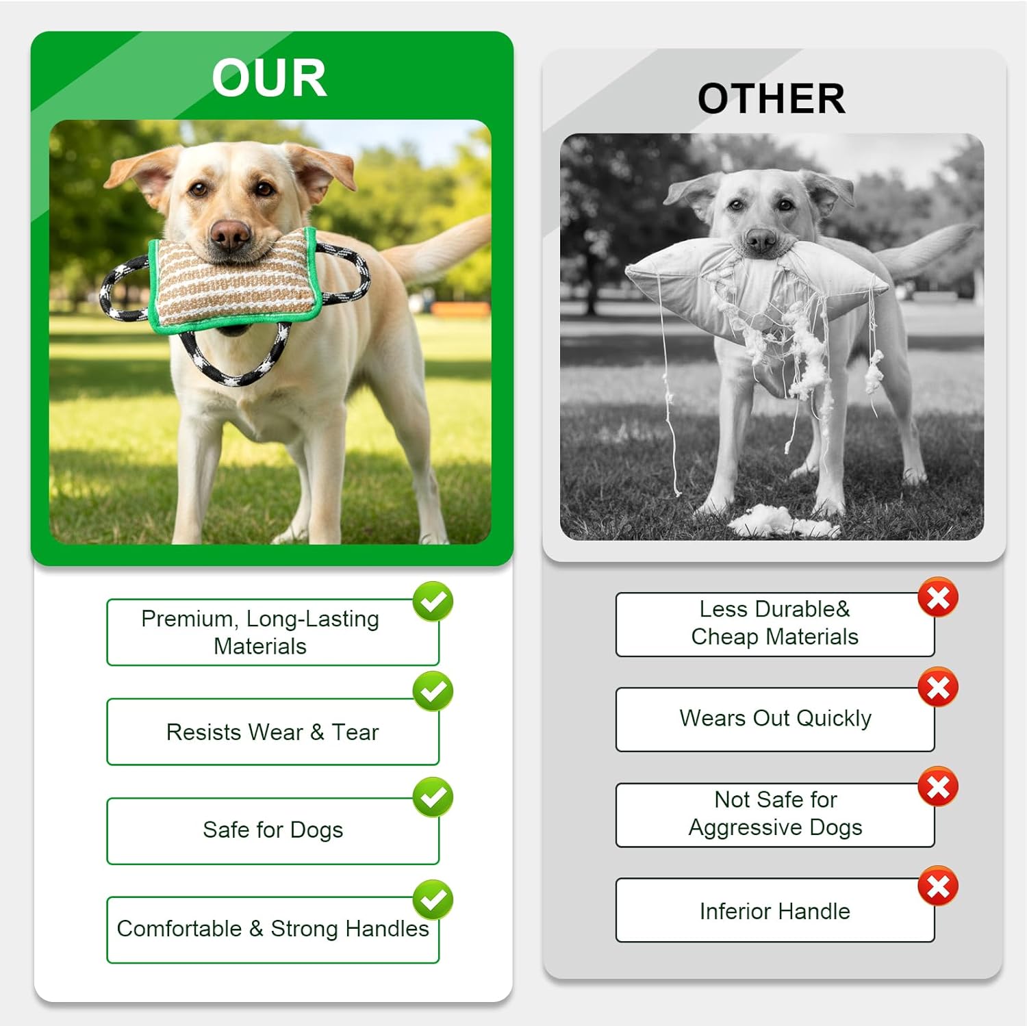 Kifmurase Durable Dog Jute Bite Pillow, 9.8“ x 6.7” Safe Biting Pad with 3 Strong Handles, Safe Tough Jute Tug of War Toy for Medium to Large Dogs Puppy Training, GreenSpecifications:Category: Dog Toy, Tug-of-War Jute Chew PillowColor: Green, BlackMaterial: JuteFunction: Dog Training, Tear-Resistant, Coarse Linen, 3-Handled Chew Pillow, German Shepherd, Adult Dog, Chew Bag, and Chew StickDimensions: Pillow Length: 9.8 x 6.7 inches / 25 x 17 cmTop Handle Length: 6.3 inches / 16 cm, Side Handle Length: 4.7 inches / 12 cmPackage Included: 1 x Tug-of-War Jute Chew Pillow