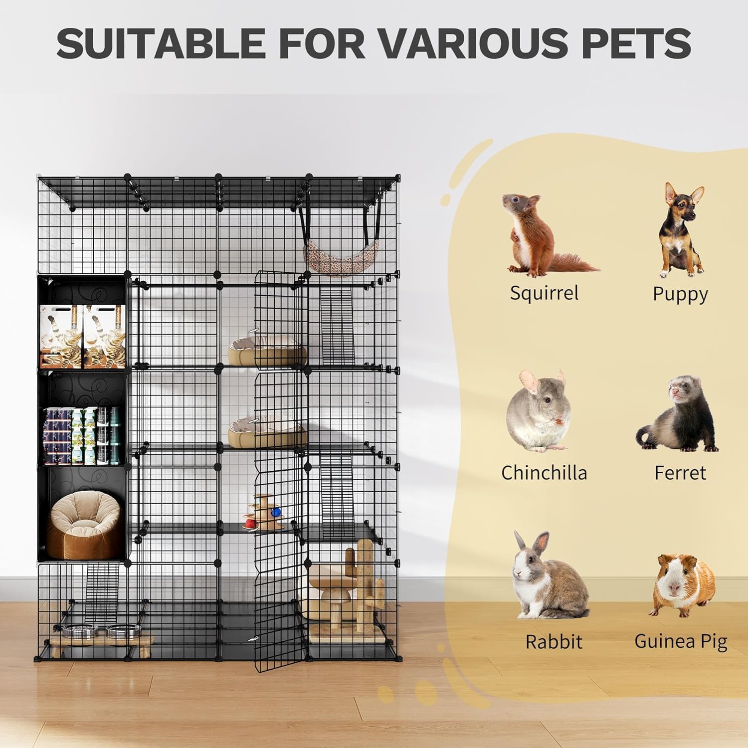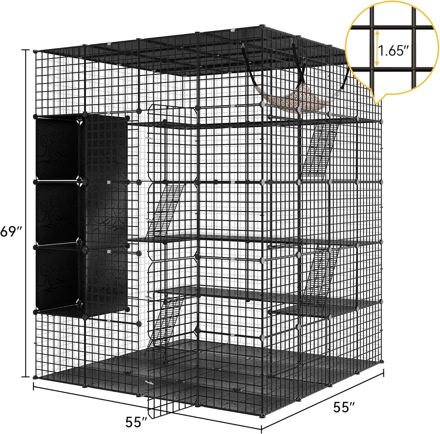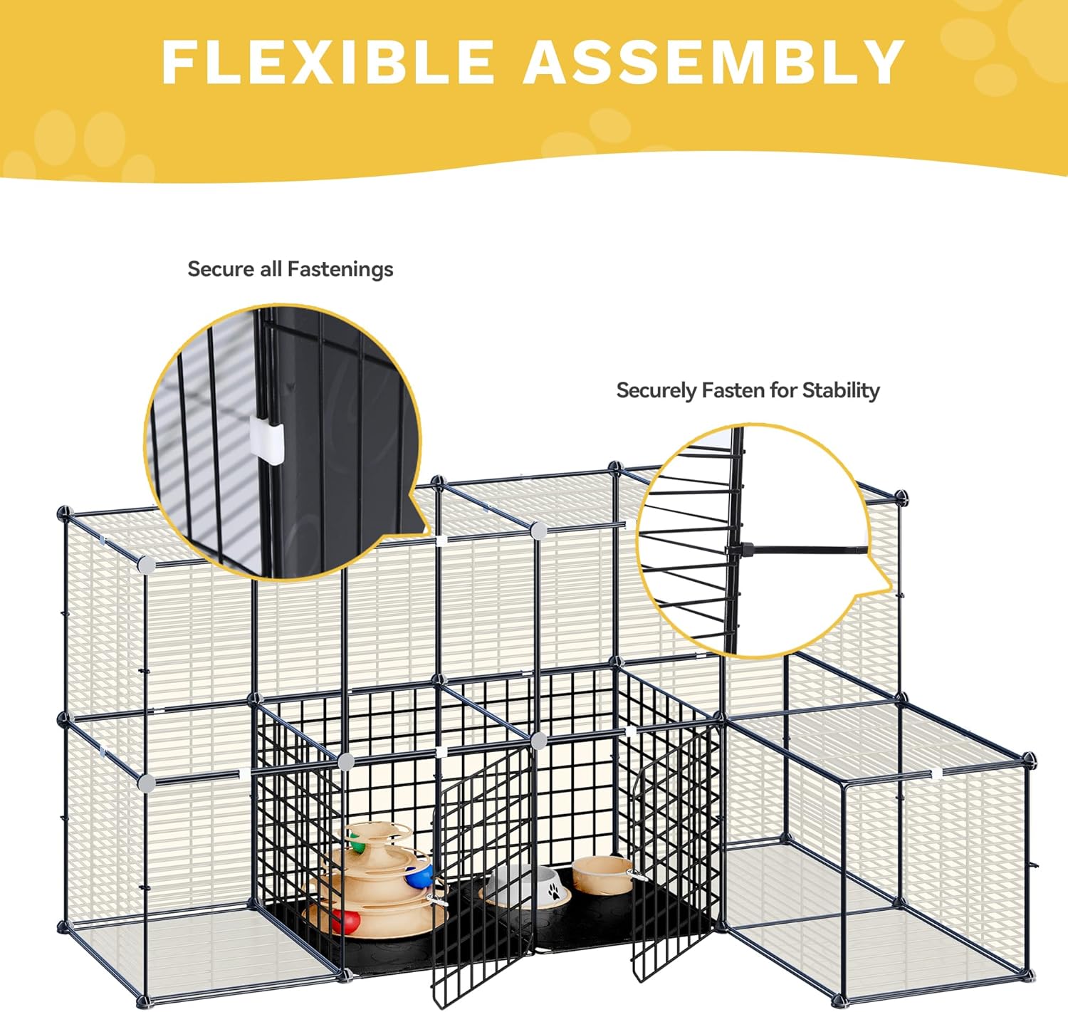 About this item Gentle on Paws & Secure Design: The cat cage features smooth platforms that protect your cat’s delicate paws, while hook-top stairs lock securely onto the iron frame for added stability. (Includes cable ties and white connectors for extra reinforcement!) Endless DIY Possibilities: Customize your cat playpen with modular panels to fit any space-whether it’s a cozy corner or a sprawling play zone. Ideal for apartments, living rooms, or even travel RVs! Indoor & Outdoor Adventure: Give your feline friend a safe haven to climb, nap, or explore! This versatile cat enclosure works in bedrooms, patios, or backyards-ideal for small animals like rabbits, ferrets, or guinea pigs too. Easy Cleaning: The removable floor mats make cleanup a breeze, ensuring a dry and hygienic environment. No more stubborn fur or spills-just a pristine space for your pets! 30-Minute Assembly: One or two people can easily assemble this cat kennel in minutes. › See more product details