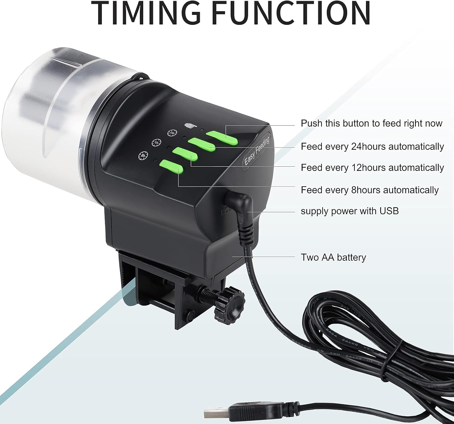 About this item 【AUTOMATIC FEEDING】Just one button push, the automatic fish feeder allows you to feed every 8hours, 12hours or 24hours automatically or feed any time manually according to your need. 【TWO TYPES POWER SUPPLY】 Powered by two AA batteries(not included) or use USB cable to connect home electricity, the 6.6 feet USB cable is included in the attachment. Also you can use two power supply at same time in case of emergency such as power outages. USB cable is the default setting, if the home power is cut off, the battery will supply power automatically. 【TWO DIFFERENT FIX METHODS】The feeder can be fixed on edge of the fish tank with a stent for aquarium without hood or fixed on the tank hood with special designed funnel base for aquarium with hood. 【TWO FEEDER CONTAINERS】Two size containers are supplied, one 100ml and the other is 200ml. Also a 4inch*4inch feeding ring is attached. 【EASY to ADD FOOD and ADJUST VOLUME】Just pushing the feeding adjusting cap to increase or decrease the feeding volume easily. suitable for most types of food like flakes, crisps, pellets, graduals etc. › See more product details