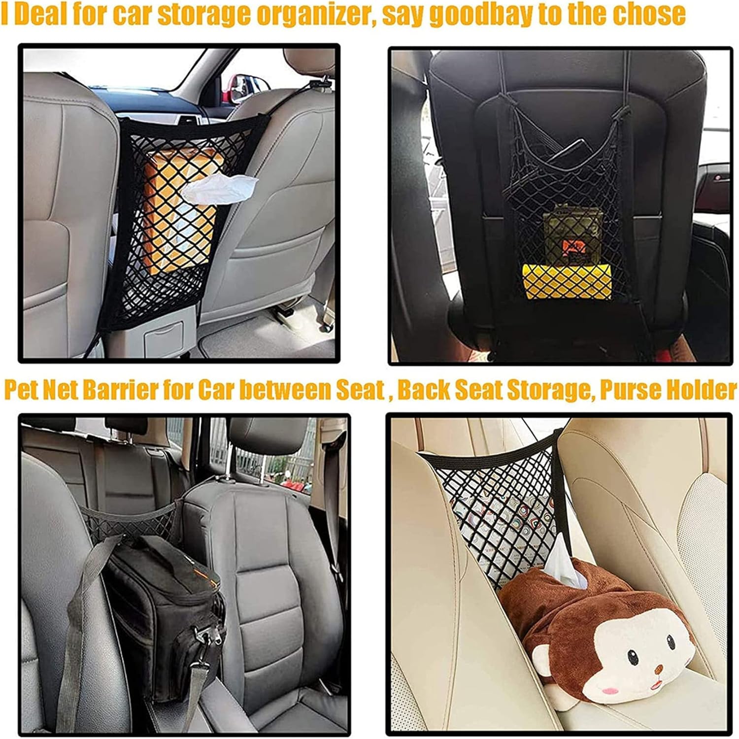 Dog Car Barrier : To prevent distractions while driving. As a pet car barrier keeps naughty pets or kids in the back seat area. Car safety for dogs and baby Four Sided Elastic Dual Mesh: Pet car barrier with premium polyester an extra thick, still lightweight design. Upgraded barrier size nearly fit for most Cars and SUVs. the stretchable pet net for car is safety, reliable and resilient Easy to install with included hooks: Four safety hooks that quickly clip to your car's headrests on the top and the seat from underneath. Just take in one minute to install and begin to use the convenient cargo netting.WITHOUT drilling, hammering or tape A Car Storage: Space saving, mount on the middle gap between the left right seats, or the seat back. Can store loose items to keep them from moving around your car. On long road trips, the mesh net is a great place for snacks, juice and bottled water What You Get: 1 X Dog Barrier Car Storage Bag In One fit for Cars SUVs. Be careful when they bounce back while install. Pls note our car dog barrier doesn't work for the car without exposed bars on the headrests or loops under the seats › See more product details