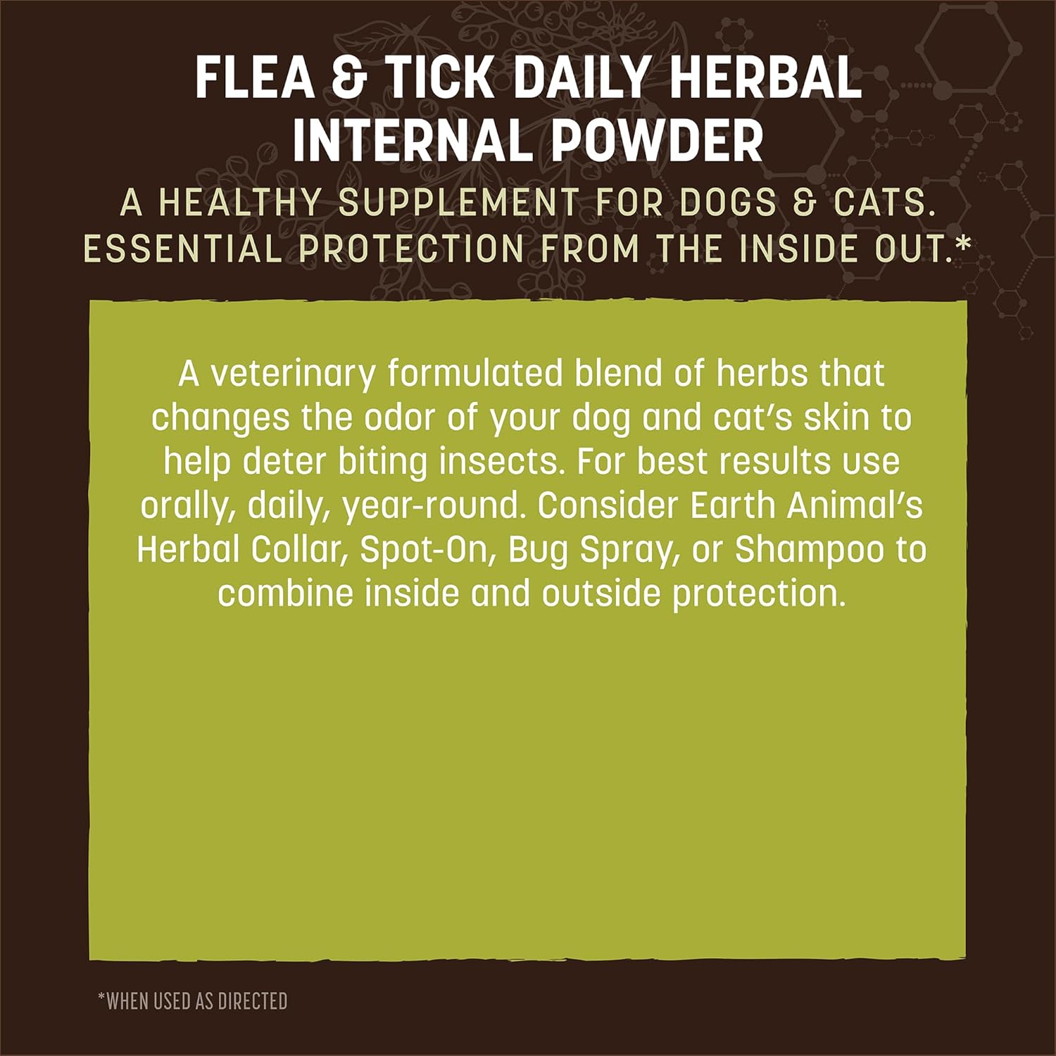 Since 1979, Earth Animal has been dedicated to helping pets live long, healthy lives by creating high-quality, wholesome foods, treats, herbal remedies, & supplements. As a holistic veterinary family, we share your goals of wellness and longevity for animals. Apothecary Flea & Tick products are veterinary formulated and made in the USA with the finest ingredients from around the world. You can trust that every choice we make thoughtfully upholds our mission to preserve and enhance quality of life for all Earth’s animals. We use only ingredients that cause no harm to animals, people, or the environment. We’ve clinically developed a way to double down on natural flea & tick protection without using risky synthetic chemicals. Our flea & tick products work synergistically. The internal products bolster the body’s immunity to insects while the external products to help repel insects. If you’re choosing the natural way to protect your pets, double down with Earth Animal and provide the best, most comprehensive protection Mother Nature can provide. Earth Animal dedicates 1% of annual net sales to efforts that preserve and enhance quality of life for animals, people, and the Earth.