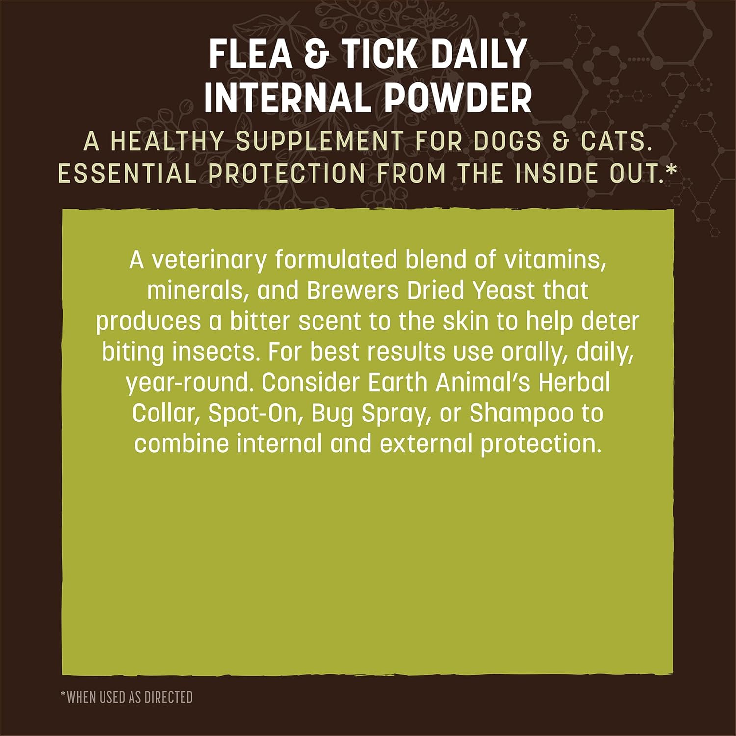 About this item THE POWER IS IN THE POWDER: A veterinary formulated blend of vitamins, minerals, & Brewers Dried Yeast that produces a bitter scent to the skin to help deter biting insects ROOTED IN NATURE, BACKED BY SCIENCE: Our products work synergistically - internal products to bolster the body's immunity to insects and external products to help repel insects outside of the body DOUBLE DOWN FOR YOUR PET'S BEST PROTECTION: Pairs perfectly with our Herbal Flea & Tick Collars, Herbal Flea & Tick Spot-On, Herbal Shampoo, and Herbal Bug Spray THE MOST COMPREHENSIVE PROTECTION MOTHER NATURE CAN PROVIDE: Animals should never carry or consume harmful chemicals, especially when it comes to regular use of flea & tick protection. That's why we offer powerful, natural solutions for people and pets MADE WITH INTEGRITY: Earth Animal, a trusted B Corp, uses the Earth's finest ingredients and the best processes to make veterinarian formulated flea & tick solutions. Made in the USA › See more product details