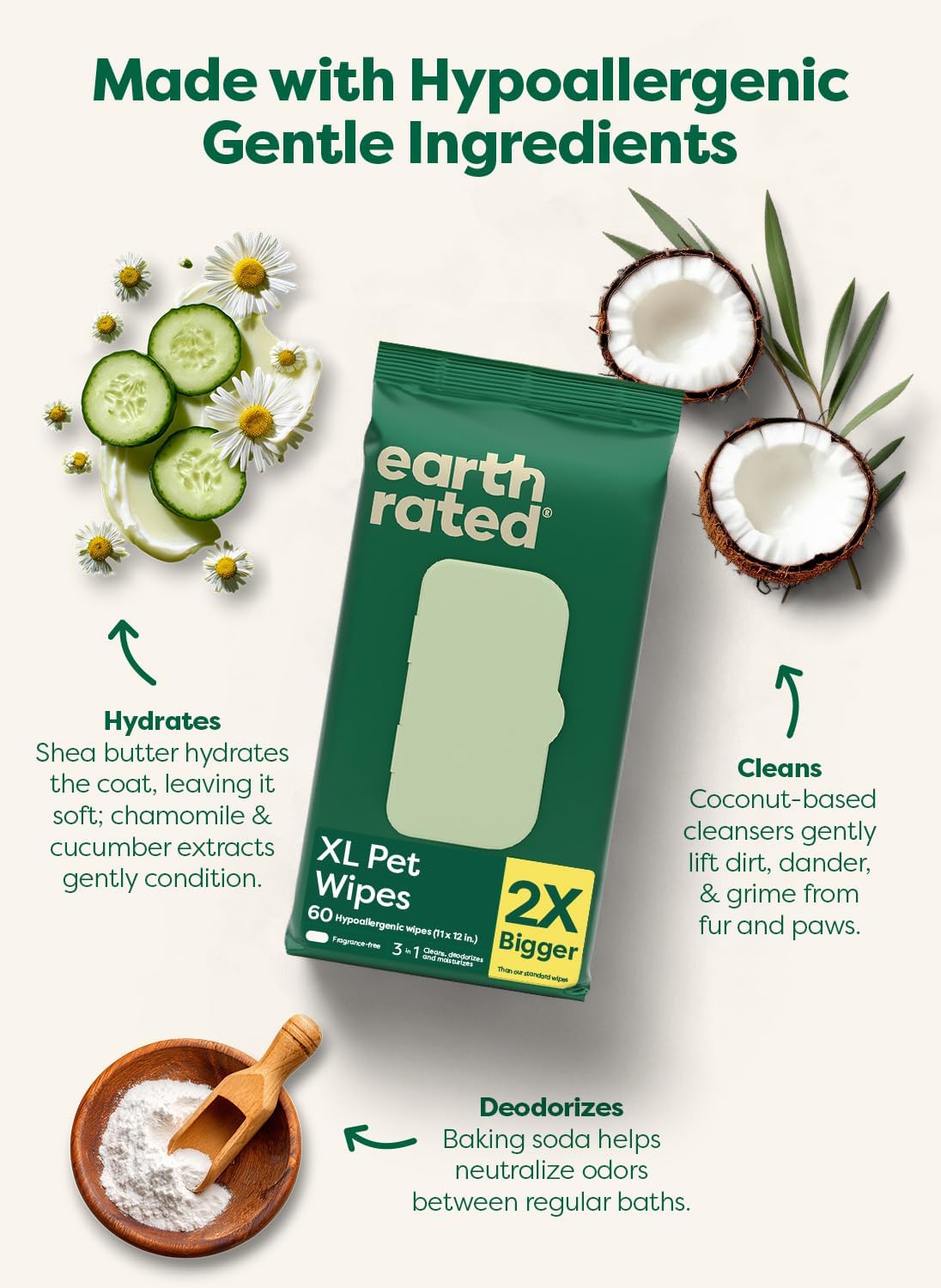 XL SIZE, BIG-COVERAGE CLEAN: At 11 x 12 in: these thick, durable sheets offer wide coverage per swipe for efficient cleanups and easy handling of big messes 3-IN-1 FORMULA FOR COMPLETE CLEANUPS: Hypoallergenic and unscented formula; cleans away dirt, hydrates for an easy wipe-down, and helps deodorize PREMIUM INGREDIENTS FOR GENTLE CARE: Formulated with soothing aloe, nourishing shea butter, calming chamomile, and refreshing cucumber DEAL FOR LARGE BREEDS AND BIG MESSES: Made for large pets, big cleanups, and life between baths. Post-adventure freshening and full-body wipe-downs are easier with XL coverage that can help you use fewer wipes EARTH RATED: We are proudly B Corp Certified. These wipes are made of USDA Certified 98% biobased materials and are Leaping Bunny Certified cruelty-free › See more product details