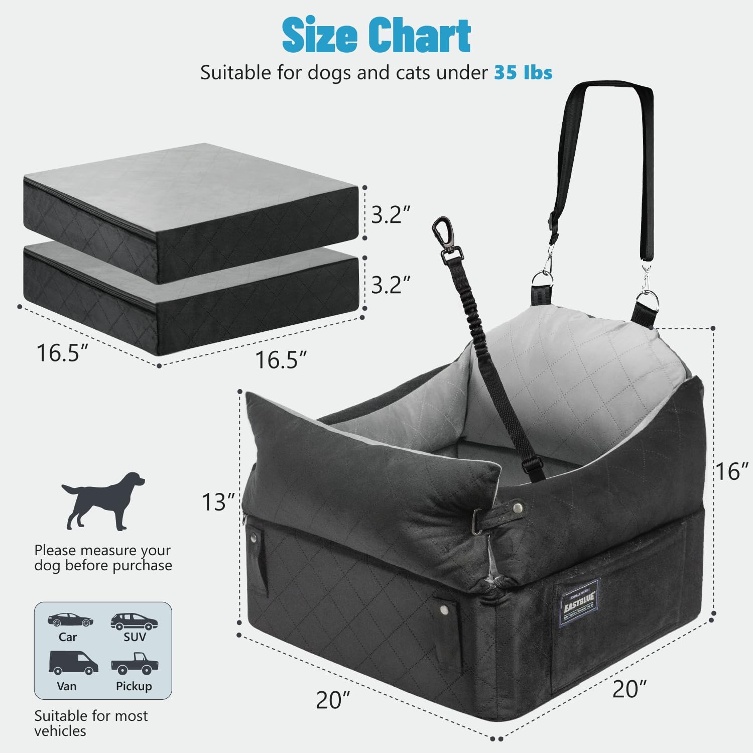 About this item Dual Securing Options for Ultimate Stability: Our innovative wrap-around fixing system keeps the dog car seat securely in place, preventing wobbling or shifting during the ride. The dog car seat can also be secured by threading the vehicle’s seat belt through the back belt path. Adjustable Height with Dual Memory Foam Pads: The dog seat features two removable 3.2” thick memory foam cushions that can be stacked or separated to customize height. Perfect for dogs of different sizes or growth stages — ensuring a better window view and a more comfortable posture every time. Supportive & Comfortable Design: The pet car seat base is made of firm, supportive memory foam, while the surrounding bolsters are filled with soft PP cotton. This thoughtful combination offers both cozy comfort for lounging and effective cushioning during braking. Easy to Clean: Our dog car seat booster comes with a fully removable and machine-washable cover for effortless maintenance. Simply unzip to remove the cover — the quick-release design makes it easy to keep your dog’s car seat fresh and clean on every trip. Professional Dog Seat Belt Included: The dog booster seat comes with a high-quality, elastic, and adjustable dog seat belt made from durable nylon. The 360° swivel metal clip prevents tangles, while the shock-absorbing stretch reduces sudden jerks — far safer than non-adjustable leashes used in other dog carseats. Versatile Design: This premium dog carseat easily converts into a car dog bed for multi-scene use – ideal for road trips, home lounging, camping, and outdoor adventures. Plus, the dog car booster seat features convenient side storage pockets to keep pet toys and essentials neatly organized on the go! › See more product details