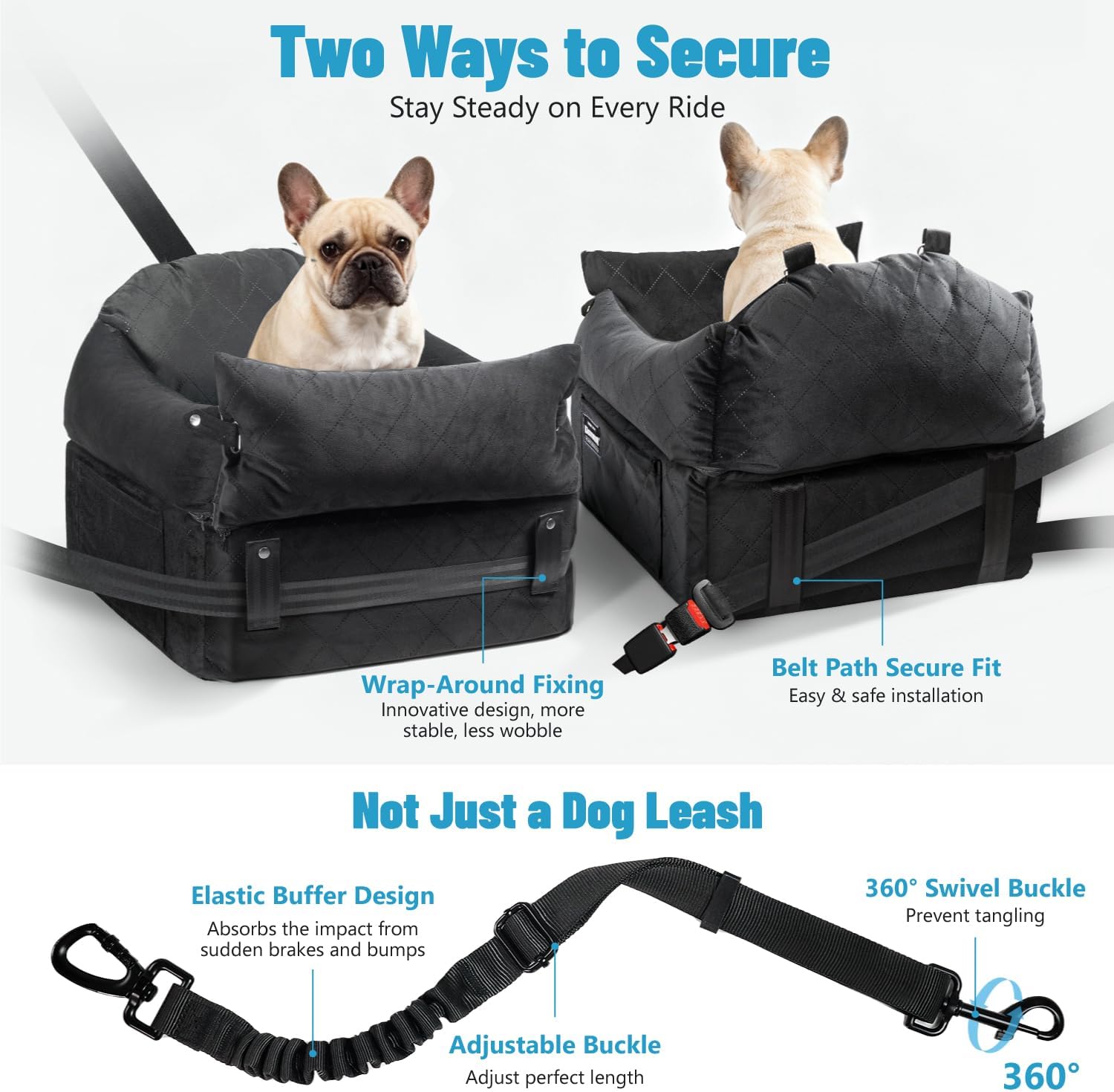 About this item Dual Securing Options for Ultimate Stability: Our innovative wrap-around fixing system keeps the dog car seat securely in place, preventing wobbling or shifting during the ride. The dog car seat can also be secured by threading the vehicle’s seat belt through the back belt path. Adjustable Height with Dual Memory Foam Pads: The dog seat features two removable 3.2” thick memory foam cushions that can be stacked or separated to customize height. Perfect for dogs of different sizes or growth stages — ensuring a better window view and a more comfortable posture every time. Supportive & Comfortable Design: The pet car seat base is made of firm, supportive memory foam, while the surrounding bolsters are filled with soft PP cotton. This thoughtful combination offers both cozy comfort for lounging and effective cushioning during braking. Easy to Clean: Our dog car seat booster comes with a fully removable and machine-washable cover for effortless maintenance. Simply unzip to remove the cover — the quick-release design makes it easy to keep your dog’s car seat fresh and clean on every trip. Professional Dog Seat Belt Included: The dog booster seat comes with a high-quality, elastic, and adjustable dog seat belt made from durable nylon. The 360° swivel metal clip prevents tangles, while the shock-absorbing stretch reduces sudden jerks — far safer than non-adjustable leashes used in other dog carseats. Versatile Design: This premium dog carseat easily converts into a car dog bed for multi-scene use – ideal for road trips, home lounging, camping, and outdoor adventures. Plus, the dog car booster seat features convenient side storage pockets to keep pet toys and essentials neatly organized on the go! › See more product details