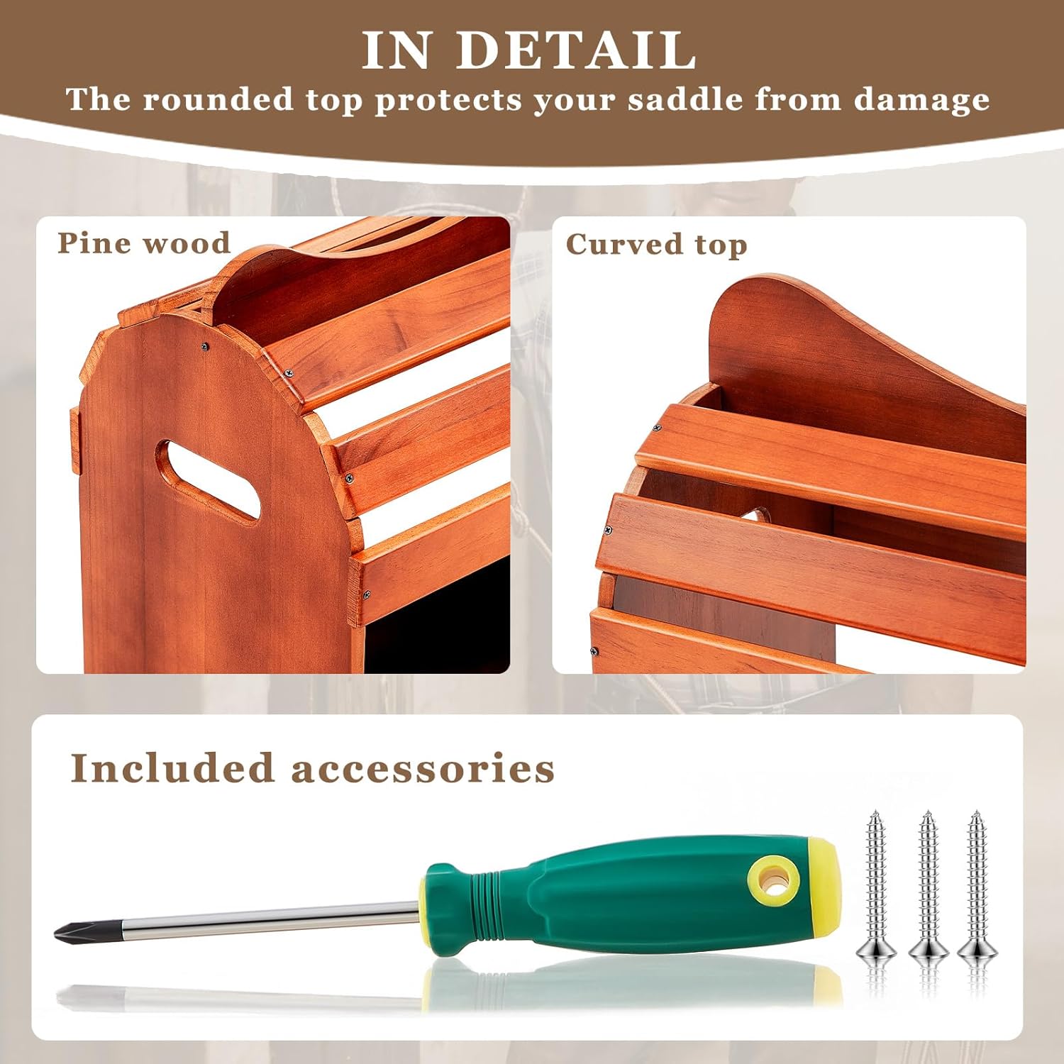Features: This pine saddle rack measures 19.69 x 11.81 x 19.69 inches, making it perfect for placing in the trunk of your car, and its curved design mimics the natural shape of a saddle, protecting it from wear and tear. Suitable for English/Western saddles, with additional storage space at the bottom. Specifications: Material: solid pine wood Color: as show Size: about 19.69 x 11.81 x 19.69 inches/ 50 x 30 x 50 cm Package includes: 1 x Pine wood arched saddle rack stand Notes: Manual measurement, please allow slight errors on size. The color may exist a slight difference due to different screen displays Small parts included, please keep them away from little kids to avoid swallowing risk