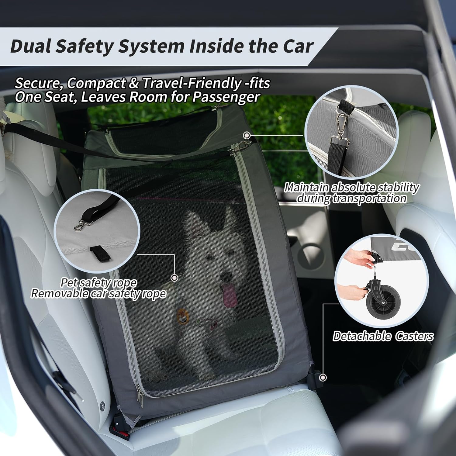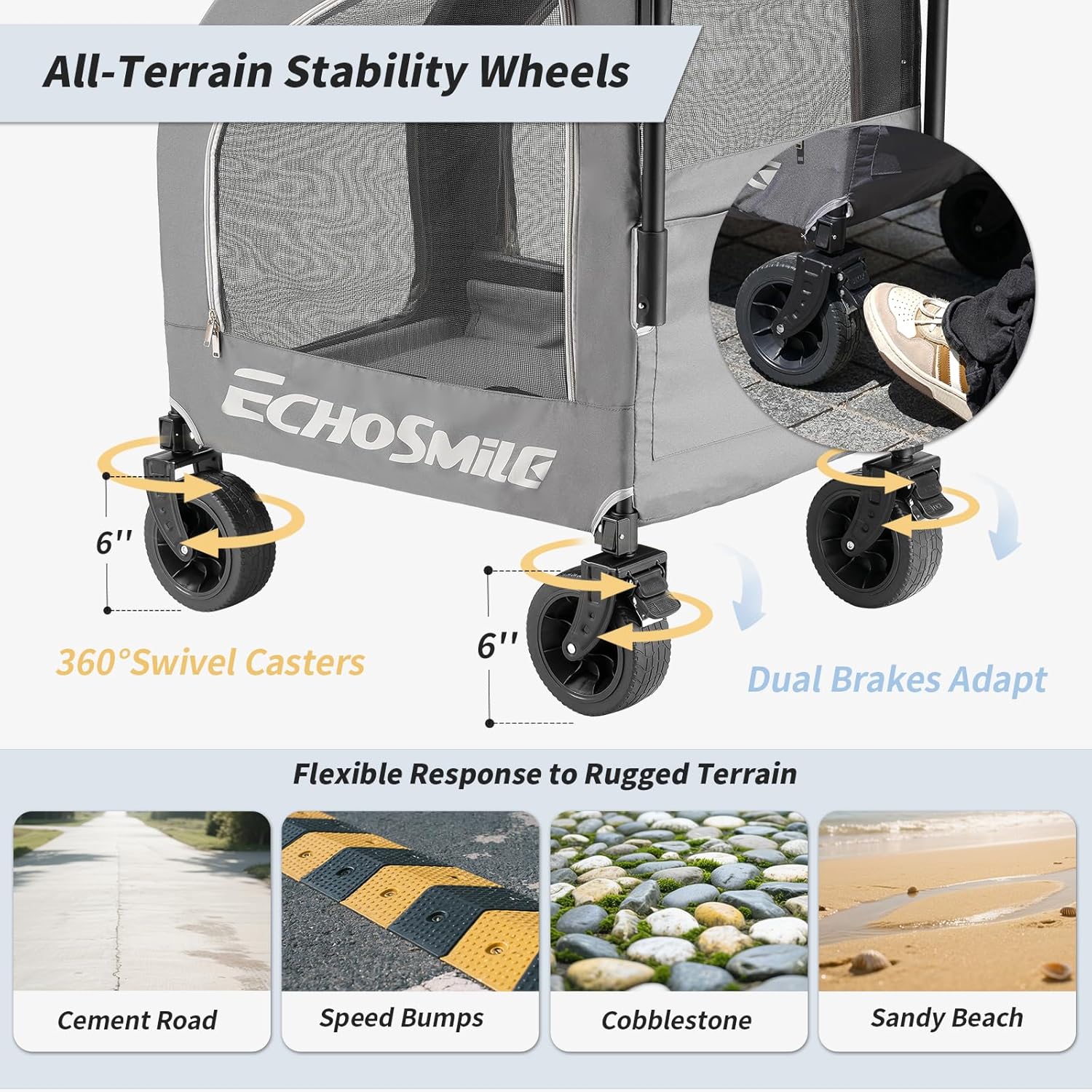 About this item 300D Oxford cloth VERSATILE DESIGN: Perfect for small to medium-sized dogs, featuring a spacious compartment with ventilation windows for comfort and visibility. EASY MANEUVERABILITY: Equipped with smooth-rolling wheels and ergonomic handle for effortless navigation during walks or travel. SAFETY FEATURES: Includes secure leash tether attachment point and reliable braking system to keep your pet safe while strolling. CONVENIENT STORAGE: Features multiple pockets for carrying pet essentials, treats, and supplies. TRAVEL-FRIENDLY: Lightweight frame construction and foldable design makes it ideal for transportation and compact storage. › See more product details