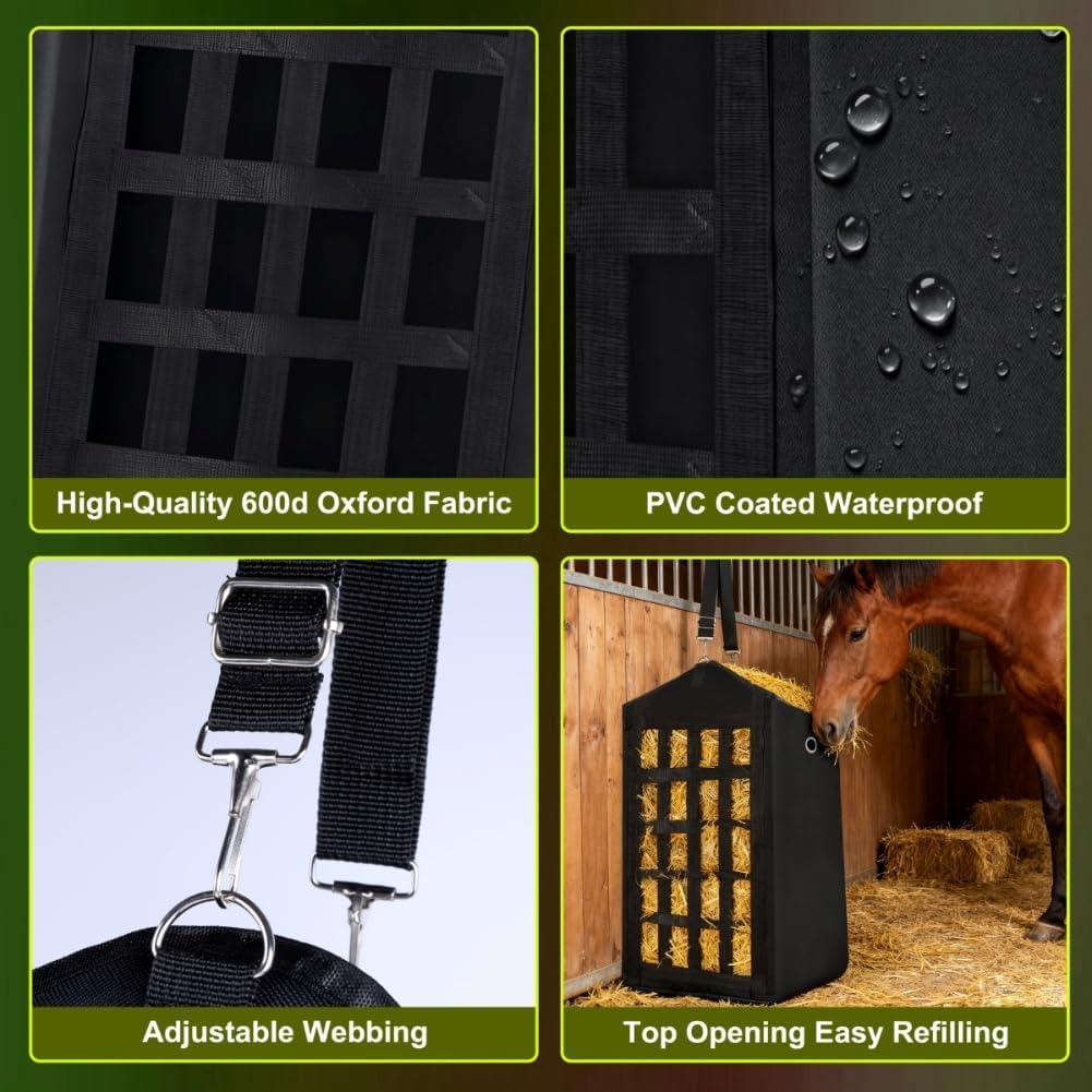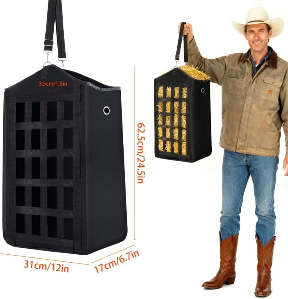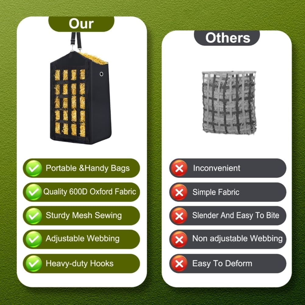 Hay Bags for Horses Slow Feed : Equipped with a slow-feed hay net on the front panel, these horse hay bags encourage slower eating habits. The design promoting natural feeding behavior, Perfect for stables, pastures, or traveling, these hay bags support overall well-being while keeping horses engaged and content during feeding. Premium Material & Reliable Construction: These horse hay bags are made from high-quality Oxford cloth, offering exceptional strength and long-lasting. Reinforced stitching enhances resistance to wear, tear, and chewing, making the bag highly resistant to being torn or damaged by horses. Designed for everyday use in stables, pastures, or during travel, this hay bag is built to withstand heavy use while ensuring a long service life and reliable performance. Easy to Hang & Adjustable : Our horse feed bags feature sturdy, reinforced webbing with durable hooks, allowing quick assembly, secure attachment, and effortless hanging on fences, stalls, or trailers. The adjustable straps let you easily set the bag at the perfect height for different horses or goats, ensuring comfortable feeding. Ideal for shows, camping trips, or everyday stable use, these bags help prevent hay waste, keep feeding areas clean, and can be easily installed, removed Easy-Fill Top : Designed with a wide, top-access opening, this hay bag makes filling and managing hay quick and effortless. Secure hook-and-loop straps prevent horses from pulling hay out from the top, ensuring the bag functions effectively for slow feeding. This thoughtful design promotes better eating habits Suitable for Multiple Livestock : Designed to accommodate a wide range of farm animals—including horses, goats, donkeys, cattle, and sheep—these hay nets are engineered to meet diverse feeding needs, ensuring convenient, efficient, and organized feeding › See more product details