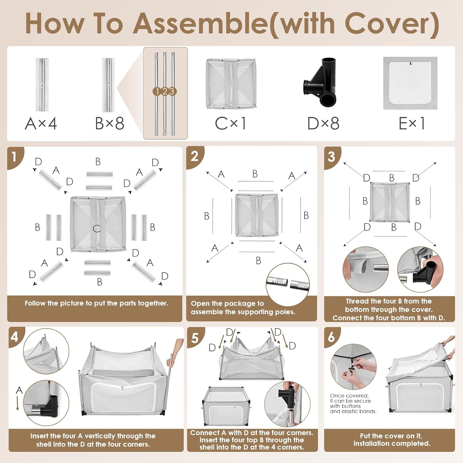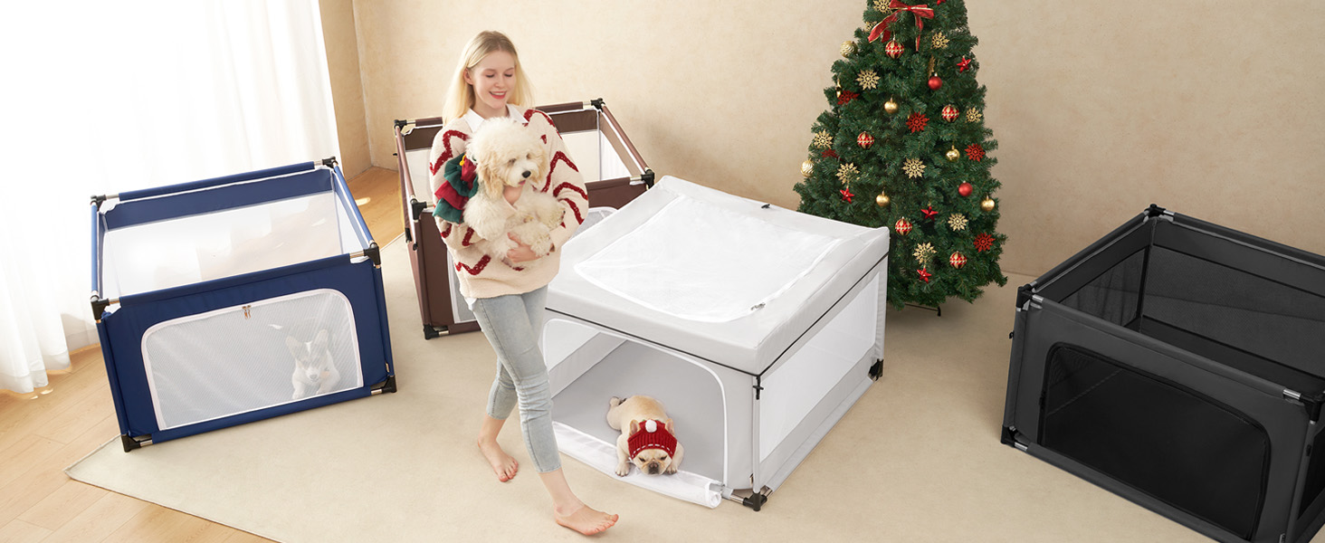 About this item HIGH-QUALITY MATERIALS: EHEYCIGA puppy playpen comes in two options: 42x42x26 inches with or without a top cover—please choose according to your needs to avoid selecting the wrong model. The cover can be conveniently detached. Crafted from 600D Oxford fabric with PVC coating, reinforced meshes, and sturdy SS tubes, this dog playpen offers structural strength, long-term durability, and excellent breathability. INDOOR & OUTDOOR: Suitable for both indoor and outdoor usage, this puppy play pen offers flexibility for different environments. Please note that outdoor use in rainy conditions is not recommended, as direct contact with water may cause the stainless steel tubes to rust, which could affect the product's lifespan. SAFETY & COMFORT: Equipped with secure locking zippers, this puppy pen creates a protected and cozy space for puppies, kittens, and other small animals. It also serves as a great interactive zone for play and bonding between pets and their owners. EASY TO INSTALL & STORE: This dog play pen requires no tools for setup and can be quickly assembled. Note that it needs to be disassembled for storage instead of being folded as a whole. When not in use, it disassembles smoothly for compact storage. Its portability makes it simple to relocate and use in various locations. EASY TO CARE: The dog pen is easy to spot clean, and its removable cover is machine-washable for thorough cleaning. For optimal cleanliness, we highly recommend using washable mats or pee pads inside, as stubborn stains from bodily fluids (e.g., during whelping) may not be fully removable. This helps maintain hygiene and extends the product’s life, making it a practical solution for pet owners. › See more product details