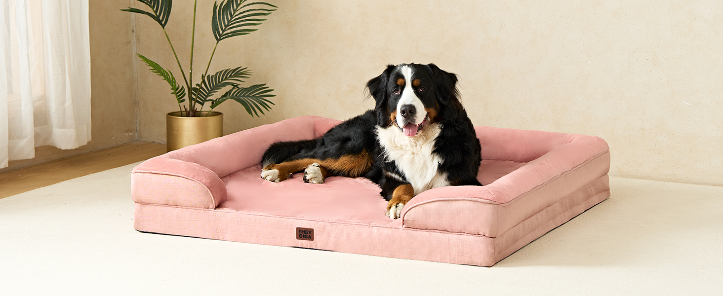 About this item MEMORY FOAM: The EHEYCIGA orthopedic dog bed features memory foam and egg crate foam to provide even support and pressure relief. It offers a good balance of softness and support, making it particularly suitable for elderly dogs to alleviate joint pressure. SOFA BED DESIGN: This bolster dog bed is designed with 3-sided bolsters to offer additional support for your pet’s neck and head, promoting restful sleep. The surrounding sides encourage your dog to snuggle in and enjoy a comfortable night's rest. WATERPROOF COVER: A waterproof film is positioned between the fleece surface and the bottom fabric, ensuring the dog bed remains dry. However, the faux linen sides are not waterproof. EXTREME COMFORT & MULTIPLE SIZES: The sleeping surface is covered with cozy fleece, creating a soft and inviting sleeping area for your pet. Whatever the size of your dog, we have a dog bed suitable for medium, large, and extra-large breeds. CARE INSTRUCTIONS: Our dog bed features a removable and washable cover with a zipper closure, making it easy to clean. Remove the foam insert, and the cover can be washed in a machine. Please note that the foam insert is not washable. Allow the bed to expand for 24-48 hours after unpacking. › See more product details