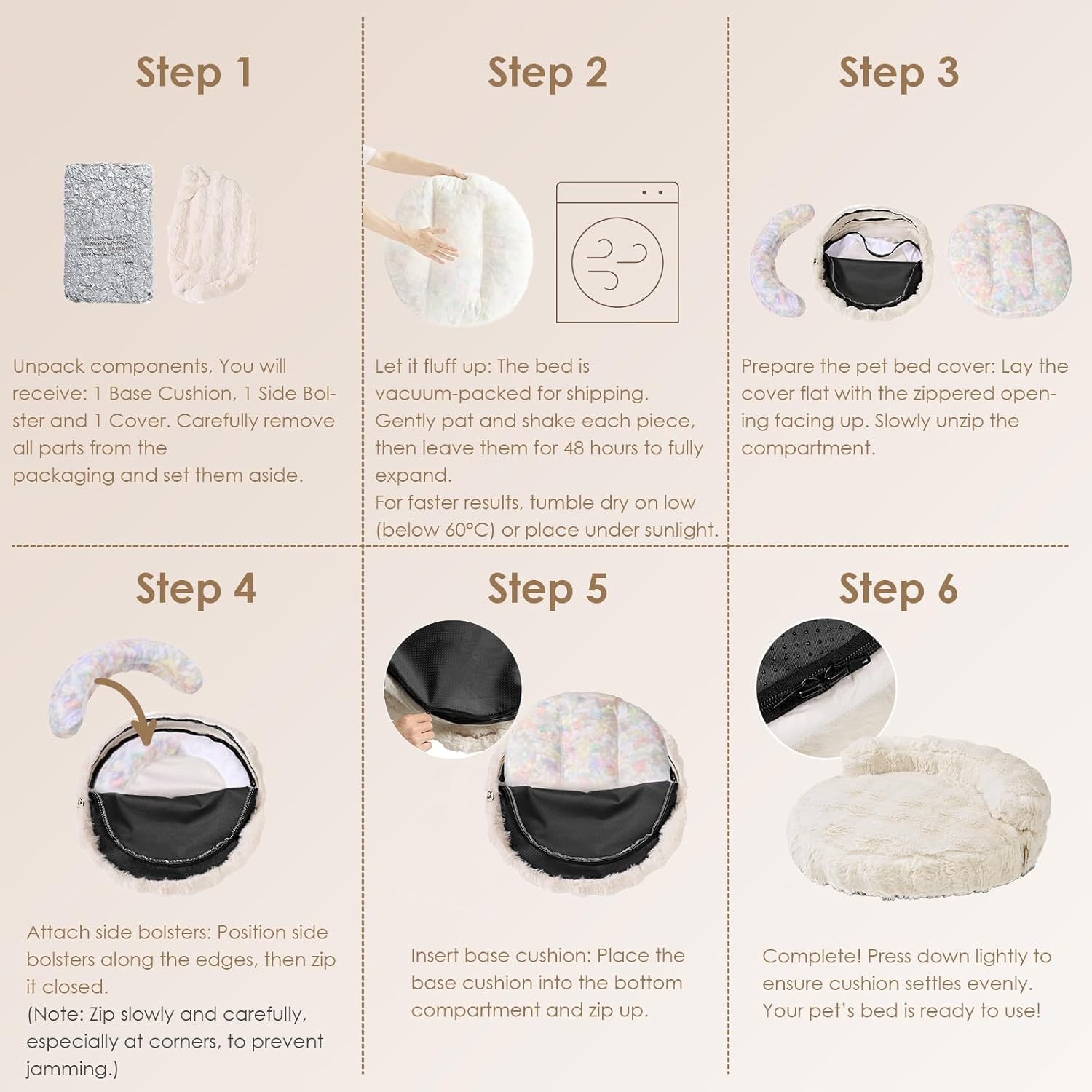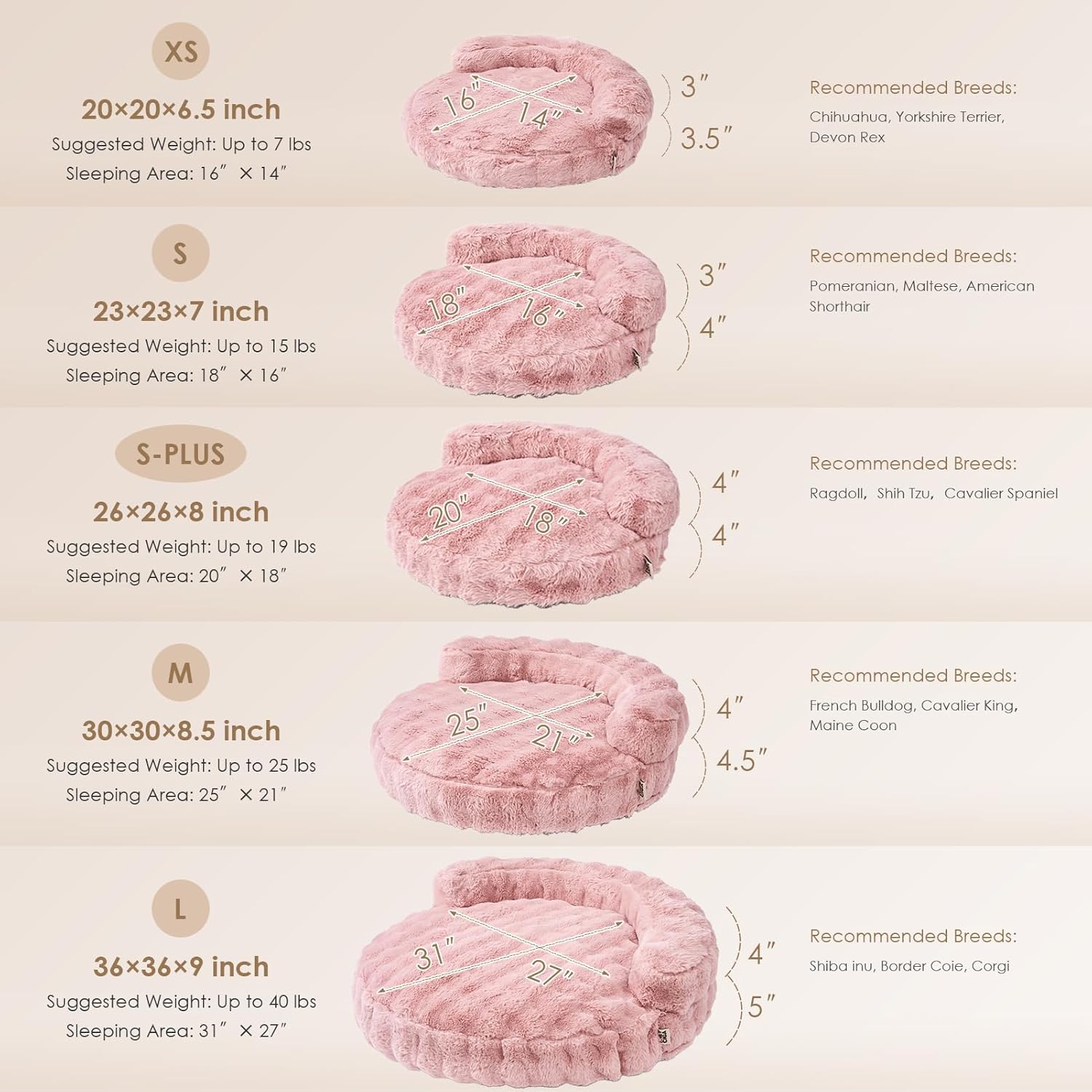About this item CLOUD-LIKE SUPPORT & BALANCED COMFORT: This pet bed blends chopped foam and polyester fiber for balanced softness and support. Ideal as a cat bed or small dog bed, it cushions the body for cozy naps and long-lasting comfort. LUXURIOUS FAUX RABBIT FUR TEXTURE: Ultra-soft bubble-textured faux rabbit fur wraps pets in warmth. Stylish enough to serve as cat furniture or a compact dog couch, it enhances any room while keeping your pet comfortable. WATERPROOF PROTECTION & EASY CARE: Built-in TPU waterproof lining guards against spills and accidents. The zippered cover is removable and machine washable for quick, hygienic cleaning—perfect for washable small dog beds and indoor cat beds. NON-SLIP STABLE DESIGN: Dotted anti-slip base keeps the bed steady on smooth floors. This round dog bed provides secure footing so pets can jump in and out without the bed sliding, ensuring safe, worry-free rest. QUICK FLUFF & FAST SHAPE RECOVERY: Vacuum-packed for efficient shipping. After opening, pat and shake, then allow 48 hours to fully expand. For faster recovery, tumble dry on low or air in sunlight to restore plush loft quickly. › See more product details