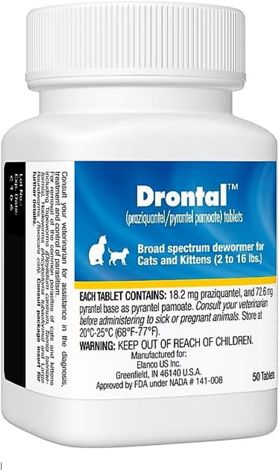 Drontal (praziquantel/pyrantel pamoate) tablets will remove tapeworms (Dipylidium Caninum, Taenia taeniaeformis), hookworms (Ancylostoma tubaeforme), and large roundworms (Toxocara cati) in cats and kittens. Drontal (praziquantel/pyrantel pamoate) broad spectrum dewormer for cats and kittens are scored for easy breakage. Each tablet contains 18.2 mg praziquantel and 72.6 mg pyrantel base as pyrantel pamoate. Tapeworms transmitted by fleas will likely recur unless measures are taken to control fleas. Flea control procedures must include insecticide treatment of the cat's environment (i.e. bedding and resting areas) as well as direct treatment of the cat with topical solutions, dips, powders, sprays or approved insecticides.