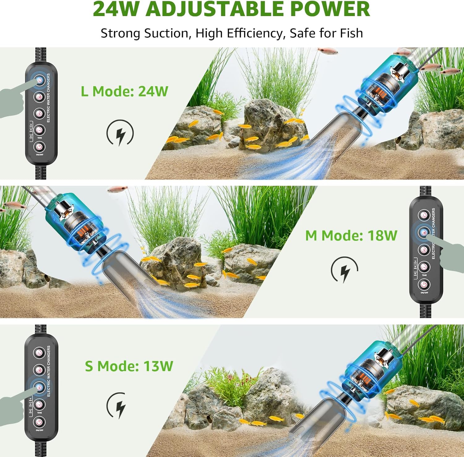 24W Adjustable Power & 10/30/60 Timing Function: This electric aquarium vacuum gravel cleaner is equipped with an adjustable pump motor, silent work. You can adjust the power to L (24W), M (18W) or S (13W) to match the size of the fish and the aquarium, higher power, stronger suction. It helps you quickly change water, which is more efficient and safer! Also you can set the timer button to switch off automatically after 10, 30 or 60 minutes 3-Stage Comprehensive Filtration: Newly upgraded filter cup with sponge, biofiltration balls & activated carbon balls, which can effectively filter impurities and return the clean water to the fish tank to realize water filtration and circulation. Cleaner than ordinary sponge filter cups and filter bags, effectively filter 99% of impurities from water. And the filter media can be washed and reused repeatedly, keep your fish healthy and energetic 8-in-1 Multifunctional Electric Vacuum Cleaner: Suness 2025 upgraded fish tank vacuum gravel cleaner can ①remove dirt, ②automatic water change, ③gravel cleaner, ④water filtration and circulation, ⑤sand cleaner, ⑥turtle shower, ⑦suck manure, ⑧brush fish tank. Different accessories can be connected for different functions, no need to buy extra tools, more convenient and efficient than other gravel cleaners Suitable for All Fish Tanks: This fish tank vacuum gravel cleaner designed with a 15cm adjustable telescopic tube and an extended 1.5m water hose, so you can adjust the length according to the size or water level of the fish tank, suitable for various height of fish tanks. Note: The external independent switch is not waterproof, please keep it away from water Complete Accessories & Easy to Use: Fish tank cleaning kit includes 2 sections of extension tubes,1 filter cup with sponge, biofiltration ball & activated carbon balls (shower head),1 1.5m outlet hose,1 gravel cleaning head,1 sand washing vacuum, 1 silicone brush head, 1 duckbill suction inlet, 1 power adapter. When using, hold the handle and press down, the water will be automatically sucked into the hose, save 90% of the time than manual! Customer service is online 24 hours, please feel free to contact us to get help › See more product details