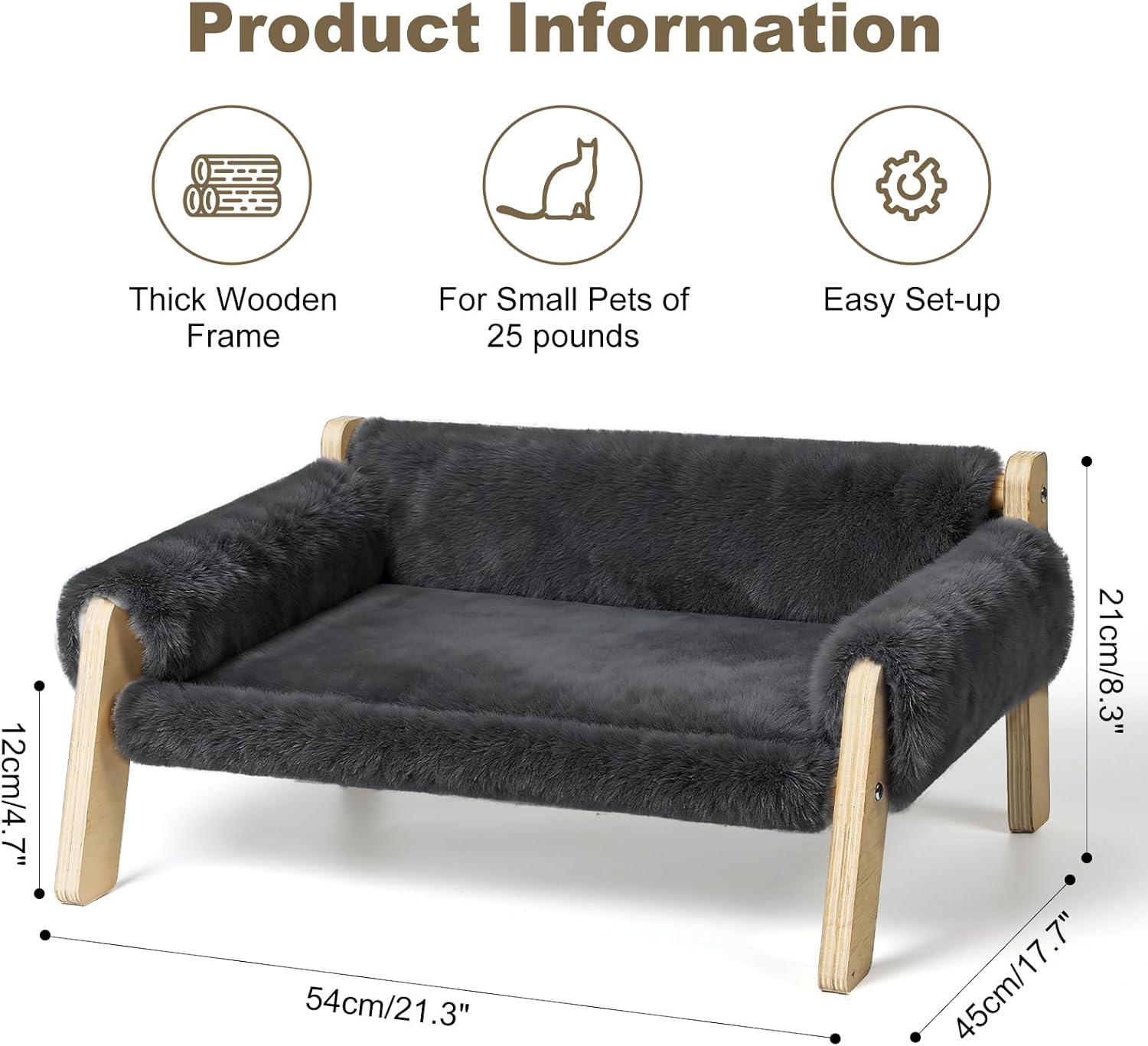 About this item Integrated Stitched Elevated Cat Couch Cover: No frustrating Ve-l-cro here! Unlike flimsy fasteners that wear out, trap lint, or lose stickiness, our seamless design keeps your cat furniture looking neat and staying durable. Perfect as a cat sofa or dog couch for your furry friend, it’s ideal for indoor cats and small pups who deserve a cozy spot. Whether you need a kitten bed or a small dog bed, this piece works beautifully in any room Supported by 3 Solid Wood Columns: This pet bed offers unshakable stability for pets up to 25 lbs. Forget wobbly frames—our sturdy construction ensures it stands strong as a cat chair or dog sofa. It’s elevated 5 inches off the ground, keeping your pet away from cold floors and drafts, making it a top choice among cat beds for indoor cats and pet beds for small dogs Filled with Premium PP Cotton: This plush cat bed is ultra-soft and comfy. The plush fabric is just the right length—no scratchy short fibers or shedding long ones that are hard to clean. Unlike thin sponge-filled pet sofas that get lumpy or crack after washing, our filling stays cloud-like soft. It’s a cute cat sofa bed your kitten or small dog will love snuggling into Removable Cover & Machine Washable: Making cleanup a breeze! No more struggling with hair and dirt trapped in non-washable pet couches. Keep your gray cat bed fresh and hygienic—perfect for kitten beds for indoor kittens and dog beds for small dogs that see daily use. It’s designed to stay looking great, even with messy pets Assemble in Just 5 Minutes: No tools needed! This cat couch bed measures 19.7 x 16.5 x 11 inch, fitting perfectly in living rooms, bedrooms, or even small corners as a cute cat bed or dog couch bed. Whether you’re assembling a small pet bed for your new puppy or a kitty bed for your senior cat, the easy setup means more snuggle time. It’s the ultimate blend of convenience and comfort for your beloved companion The frame is made of FSC-certified wood › See more product details