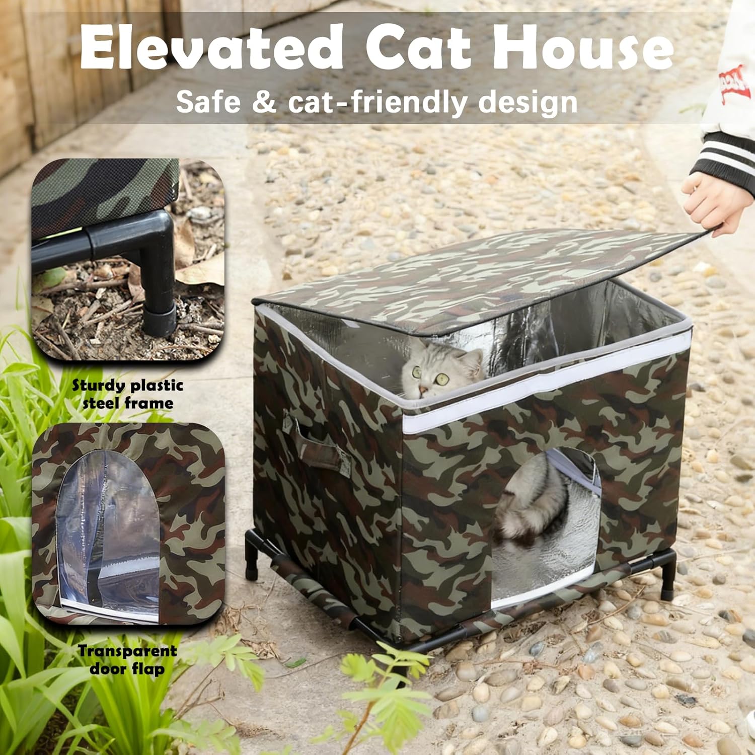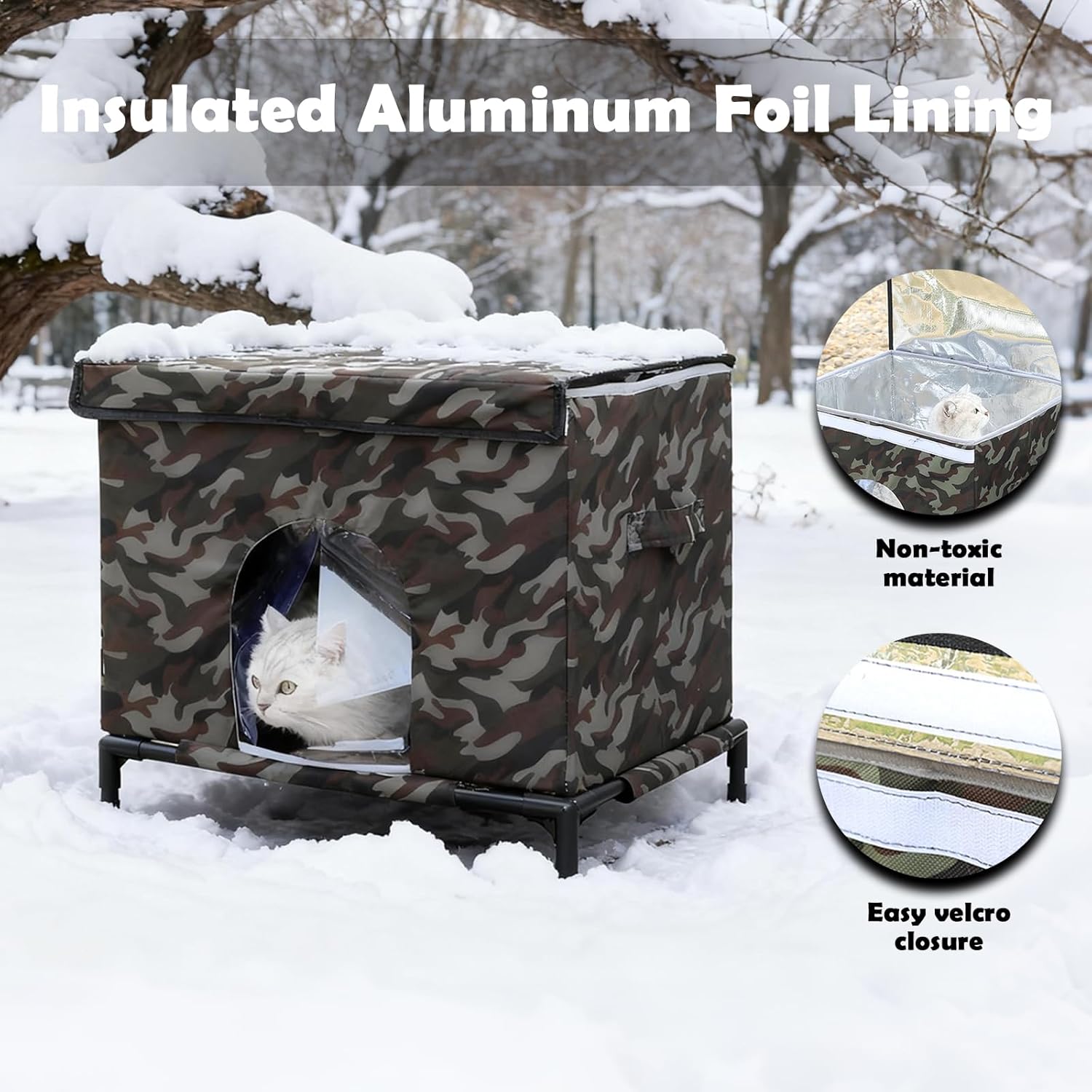 About this item 【Weatherproof Elevated Outdoor Shelter】This outdoor cat house weatherproof design creates a secure refuge for outdoor felines. The raised platform keeps the house off the ground, providing a cat shelter outdoor weatherproof solution that protects cats from rain, wind, bugs, and moisture. Perfect for pet cats and community cats alike, it works as reliable cat houses for outdoor cats in any season. 【Durable, Scratch-Friendly Construction】Built with reinforced oxford fabric and a strong plastic-steel frame, this outdoor cat shelter allows cats to scratch freely without damaging the structure. It is sturdy enough to serve as a dependable feral cat shelter, giving outdoor cats a safe place to rest, hide, and play. 【Insulated & Cozy Interior】The interior is lined with thermal aluminum foil, making it an efficient insulated outdoor cat house that locks in warmth and blocks out dampness. Designed as a self warming cat bed, it keeps cats warm naturally—ideal as an outdoor cat house for winter and a year-round insulated cat house outdoor option for both pets and feral cats. 【Secure Multi-Purpose Haven】Functioning as a cat bed outdoor, outdoor cat cave, and outside cat house weatherproof shelter, it provides versatile protection. The transparent front flap shields cats from the elements while letting them observe their surroundings, enhancing their sense of security and allowing owners to easily check on them. 【Portable Indoor & Outdoor Use】Lightweight and easy to assemble, it also works as a cozy indoor hut. Breathable mesh panels keep air flowing, and dual side handles make it simple to move or reposition. Suitable for cats up to 20 lbs, this flexible shelter transitions effortlessly between a portable tent, indoor cat house, and weather-resistant outdoor sanctuary. › See more product details