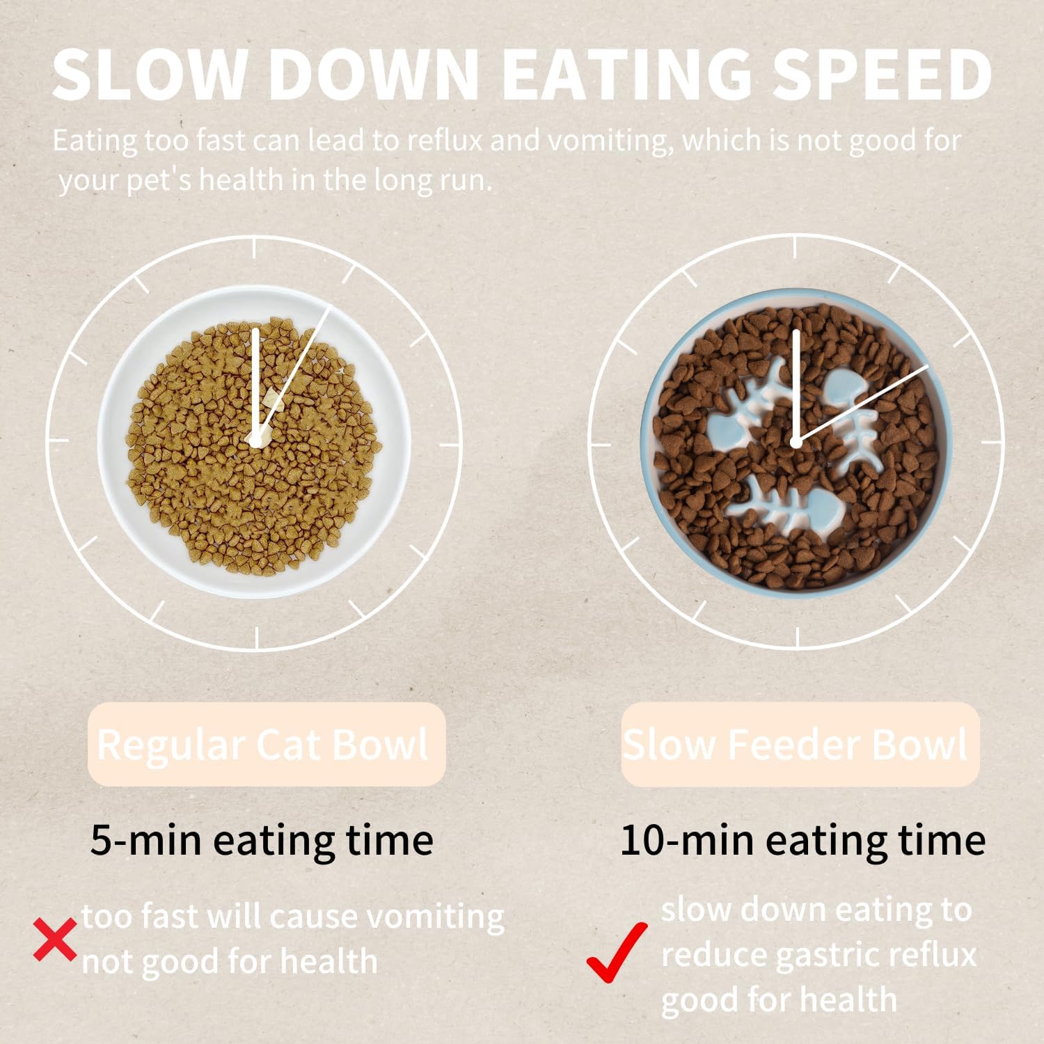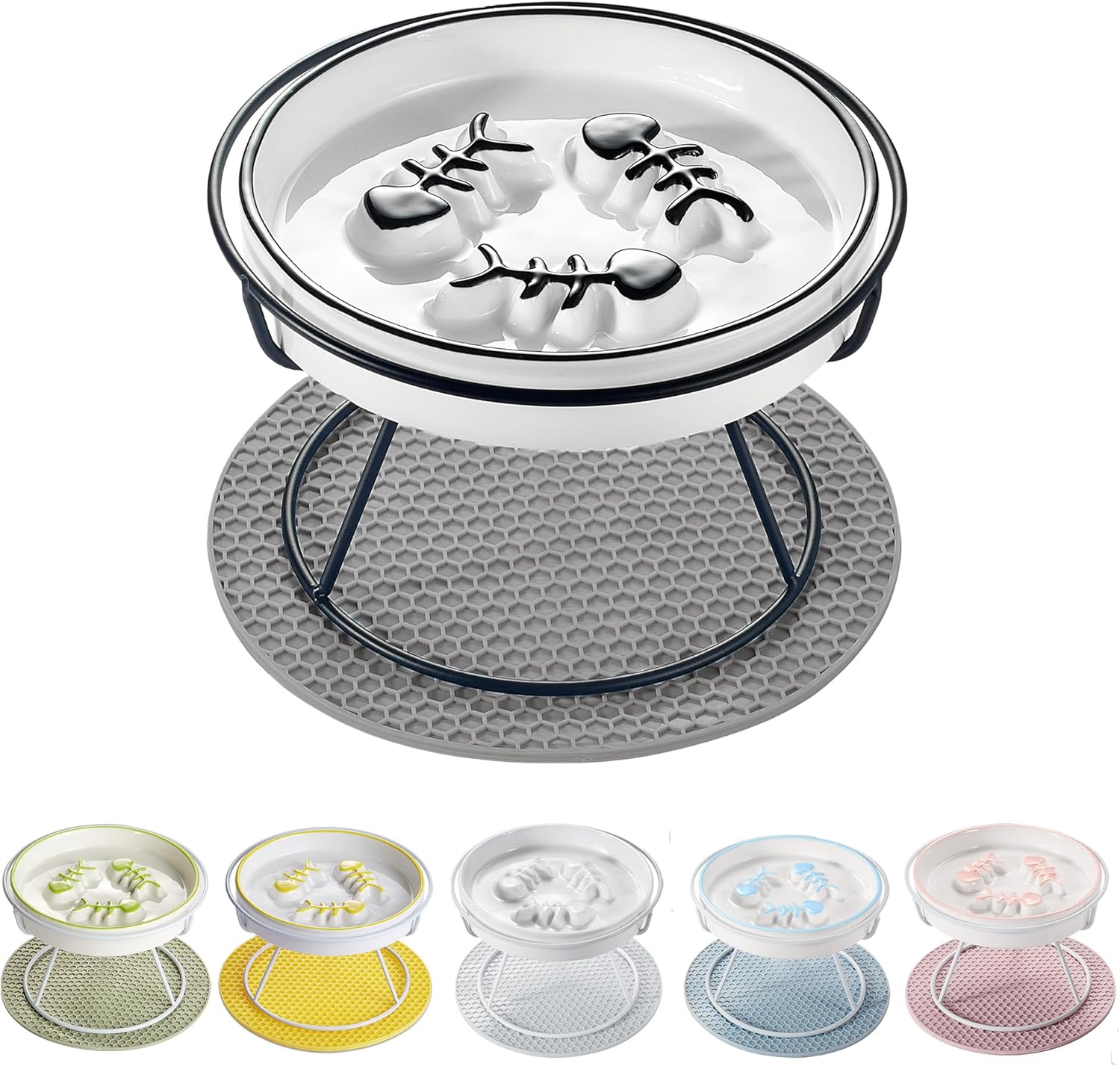 About this item Made from food-safe, non-toxic, and eco-friendly materials: ceramic, reducing the black chin issue, ensuring the pet's safety during feeding and reducing environmental impact. The fish bone protruding from the middle of the plate can effectively slow down the cat's eating speed and the elevated design of the bowl aid in better digestion by aligning the cat's mouth with its stomach, reducing the occurrence of vomiting and stomach discomfort. The raised dog slow feeder bowl prevents the pet from flicking wet food out. 4'' sturdy metal base and heavy duty ceramic food plate, prevent impact and keep the ground clean and tidy. the 5.9" wide slow feeder cat bowl with Tilted Design allows cats to eat food in a more correct position for comfort. Suitable for cats and dogs with arthritis or other mobility-limiting issues. Dishwasher and microwave safe, the detachable bowls are convenient to clean and can be used for both dry and wet food, making feeding time enjoyable for both the pet and the owner. Suitable for multi-cat family. › See more product details