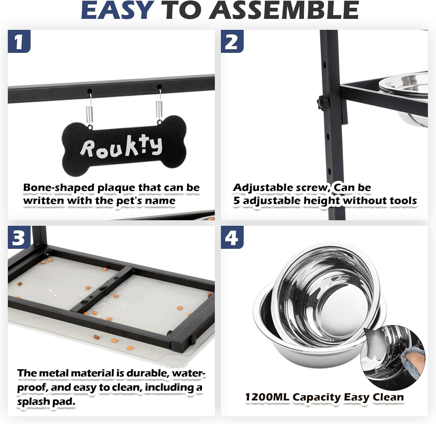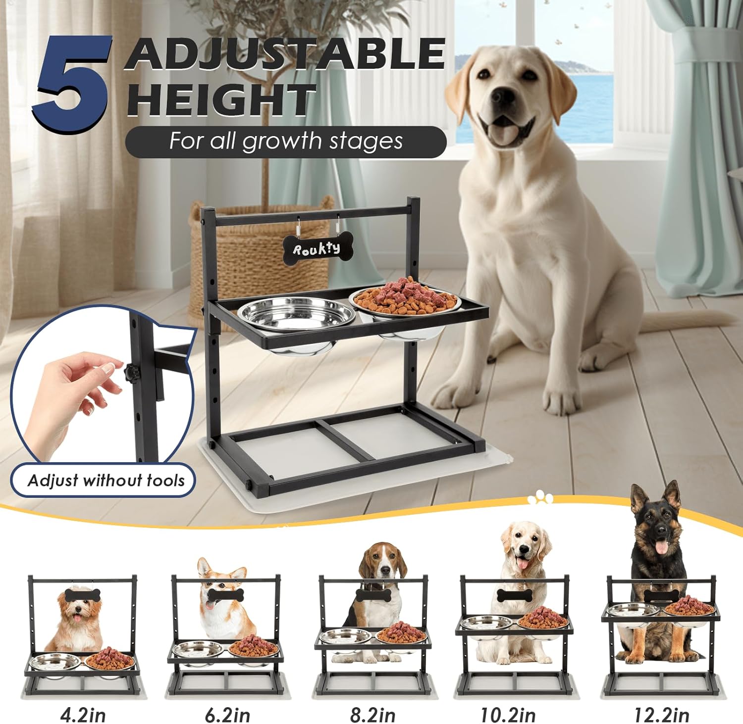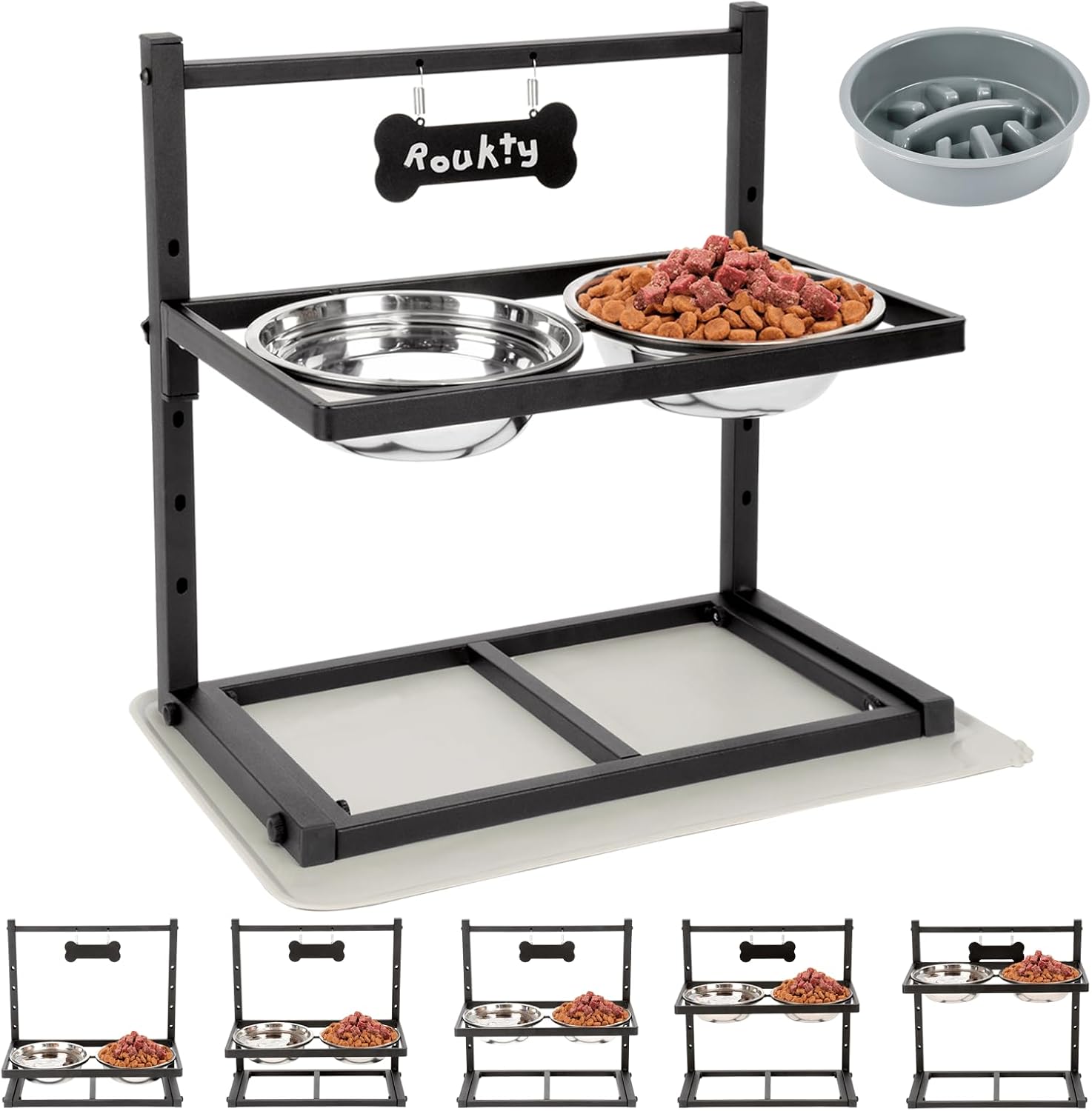About this item 【Elevated Slow Feeder Dog Bowls】Our Elevated Dog Bowls stand comes with a Slow Feeder. Designed with ridges and bumps, the Slow Feeder works to reduce your pet's eating speed, prevent bloating, and improve digestion. This feature is particularly important for dogs who tend to eat too quickly or have digestive issues 【5 Heights Adjustable】 You can adjust the raised dog bowl to 5 heights (4.2", 6.2", 8.2",10.2", 12.2") so it can be used for any size dogs or as they grow from puppy to full grown. Dogs will eat-drink in a more comfortable way, this will help them reduce stress on the neck, joints and muscles, since they don't have to bend down as far to reach their food 【Durable and Stable】 High quality rustless full metal material frame, powder coated steel, much heavier, so the elevated bowl stand is completely stable and will not collapse, easily move or overturn when eating or drinking water 【No Mess Floor】The elevated dog bowl with a spill proof mat. It can works great to collect the water and food to avoid them spill over and keeps your floor or carpets clean and dry 【Easy to Clean】Our dog bowl stand with two removable stainless steel dog bowls. The dog bowl material is rust-resistant, durable, dishwasher-safe and easy to clean. The 1200ml dog food bowls can meet the pet's daily diet and drinking water needs, and the large capacity dog bowls is more convenient for large dogs 【After-sale Service】ADENGL Dog food bowls come with a warranty, if you have any questions about the dog feeder please contact us promptly and we will reply within 24 hours › See more product details