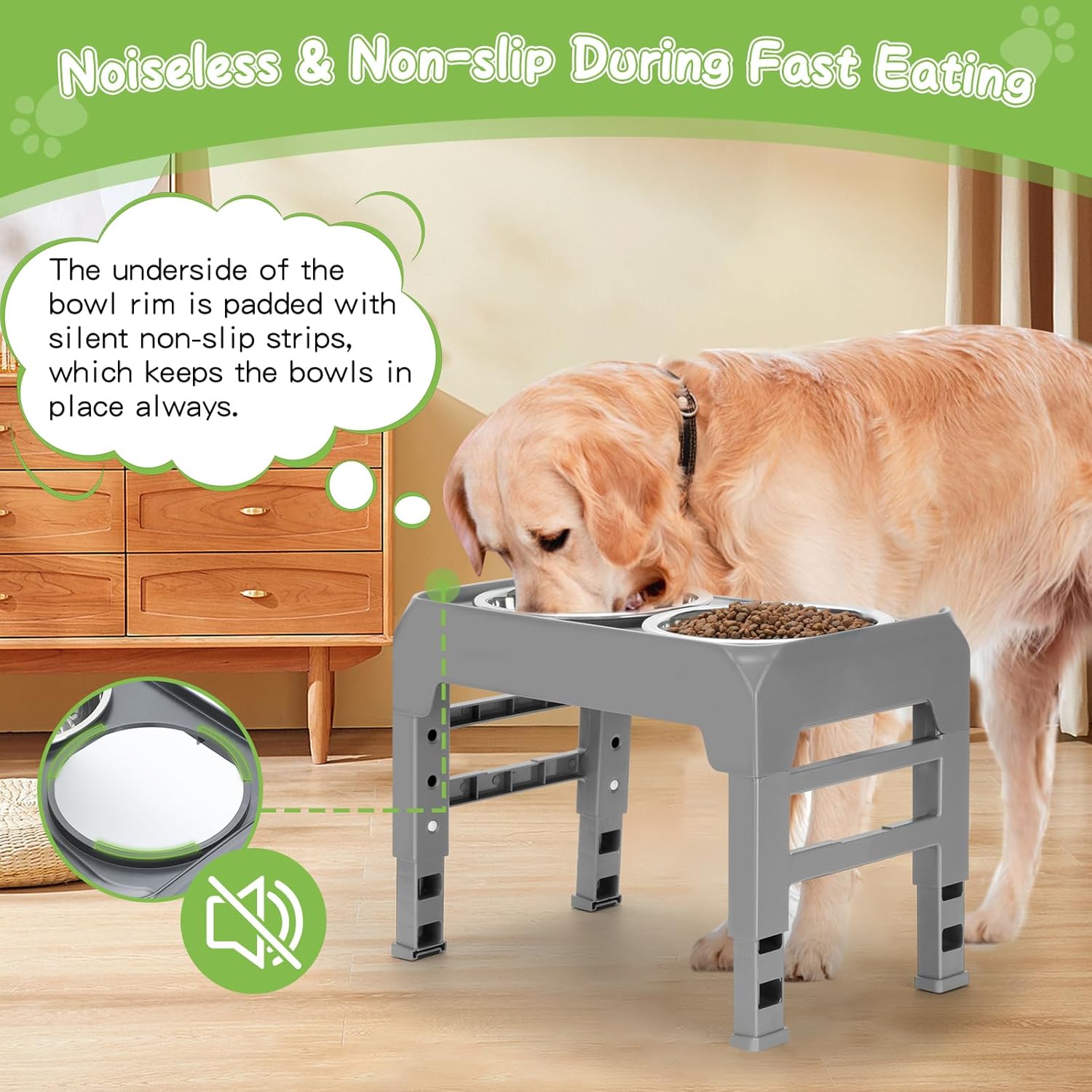 About this item 🐕Adjustable Height for Medium & Large Sized Dogs: Responsible for your furr friend's diet from puppy to senior! Our elevated dog bowls are adjustable for 4 heights (12.36", 10.75", 9.2"and 3.7" ) can not only clearly less of a stretch for dog to reach the food and water, but also easy for us to reach the dog bowls when it comes to leaning over. 🐕Keep Healthy Dining Especially for Injured Or Older Dogs: The raised dog bowl can help the dogs eat in good position, relieving their neck pressure and prevent vomiting. This is an essential dog supply, particularly for dogs who have difficulty in eating or bending down. The rounded corners of the dog bowl stand also avoid accidental bumps or injuries. (Much safe dog feeder friendly for medium and large dogs.) 🐕Much Thicker & Durable Stainless Steel Dog Bowls: Our heavy duty 50oz stainless steel elevated dog bowls can hold more and use longer than others. Also, our dog bowl is effortless to pick up, instead of reaching to underneath of the bowl and pushing them out. Super easy to clean with dishwasher. 🐕Non-slip & Noiseless: We added the rubber edges on the bowl holder and anti-slip foot pads on the legs to ensure the bowls and stand keep in place even during fast eating. Take your dining experience with your dog up a notch! 🐕Perfect for Traveling: The fold-able design of our dog food bowl stand make it easy to pack and carry if have outgoings, perfect for both home and travel. No need to install. Just open the legs and press them down to lock is fine. Adjusting the height is a breeze too – just press the white button and pull the legs to your required height. › See more product details