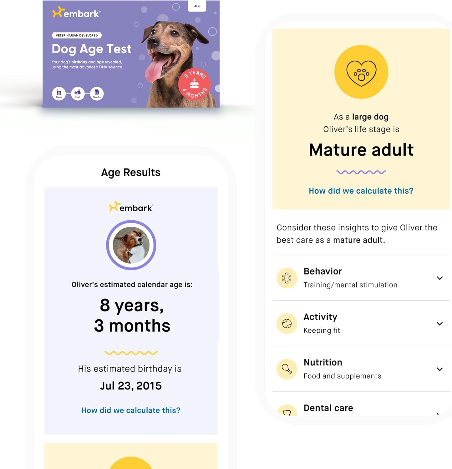 About this item IMPORTANT NOTE: Embark’s Age test works best for dogs who are past the puppy stage. BREED + HEALTH TEST: Get your dog’s breed mix with 99% breed ID accuracy—the most accurate breed breakdown on the market. We test for over 400 breeds, including dingoes, coyotes, wolves, and village dogs. Screen for over 270 genetic health risks and 55 physical traits, with actionable insights to help you give your pup the best care possible. You can also connect with your dog’s relatives using the world’s first relative finder. Embark dogs have reunited with siblings, parents and offspring. DOG AGE TEST: Using the science of epigenetics, Embark measures DNA methylation to estimate your dog’s age and birthday. 77% of dogs have a true birthday within 12 months of their estimated birthday. You’ll also get life stage tips developed by veterinarians to keep your dog healthy throughout their life. EASY TO COMPLETE WITH FAST RESULTS: You can complete the whole process of activating your kit to collecting your dog’s DNA sample in less than 5 minutes. Breed + Health Test results are typically available in 2–4 weeks. Age Test results are available in 4–5 weeks. We’ll keep you updated every step of the way. EXCELLENT SERVICE: Have a question about your results? Just talk to one of our dedicated vets or geneticists—they’re ready with the answer. › See more product details