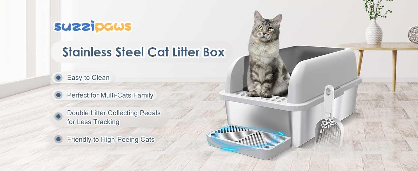 - Directions: Suzzipaws Enclosed Stainless Steel Cat Litter Box with Lid Extra Large Litter Box for Big Cats XL Metal Litter Pan Tray with High Wall Sides Enclosure, Non-Sticky, Anti-Leakage, Easy Cleaning