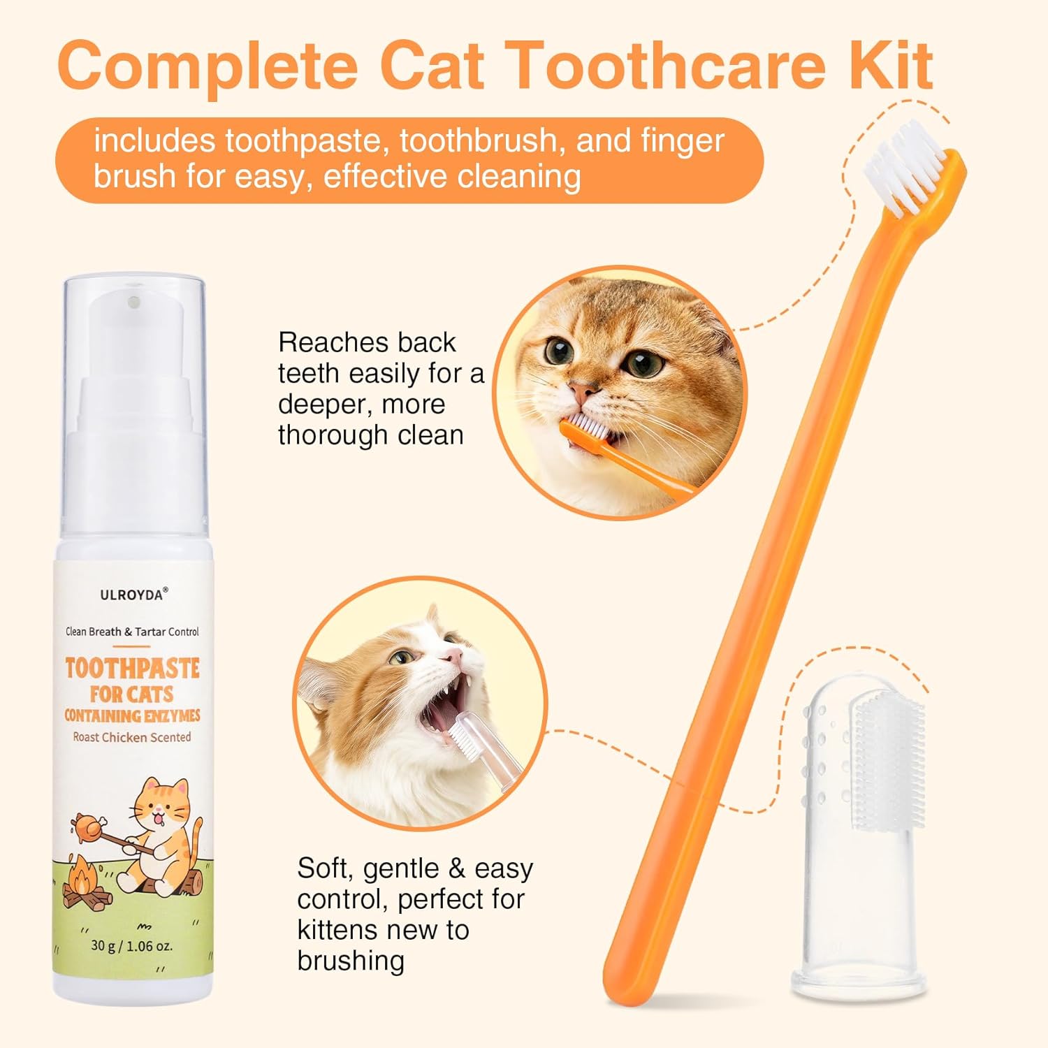 About this item Gentle & Natural Formula: Made with mild, pet-safe ingredients and natural enzymes (Protease & Lipase) that gently break down plaque and tartar. This toothpaste keeps your cat’s teeth clean and gums comfortable—safe even if licked or swallowed Plant-Based Soothing Care: Enriched with oat and botanical extracts, it helps soothe gums, reduce irritation, and support overall oral health. Each ingredient is carefully selected to provide gentle protection and a calming brushing experience Completed Cat Dental Kit: This toothcare kit for cats includes a roast chicken-flavored toothpaste, a toothbrush, and a finger brush. Everything you need in one easy to use kit, it effectively cleans teeth, promotes healthy teeth and fresh breath Irresistible Roast Chicken Flavor: Specially crafted with a savory roast chicken flavor that cats naturally enjoy. The tasty formula helps make brushing easier and stress-free—turning dental care into a bonding routine between you and your pet Easy Daily Routine: Say goodbye to stinky kisses and hello to healthy smiles. Designed for cats and kittens, this enzymatic toothpaste fights bad breath, keeps teeth clean, and makes daily care quick and effortless › See more product details