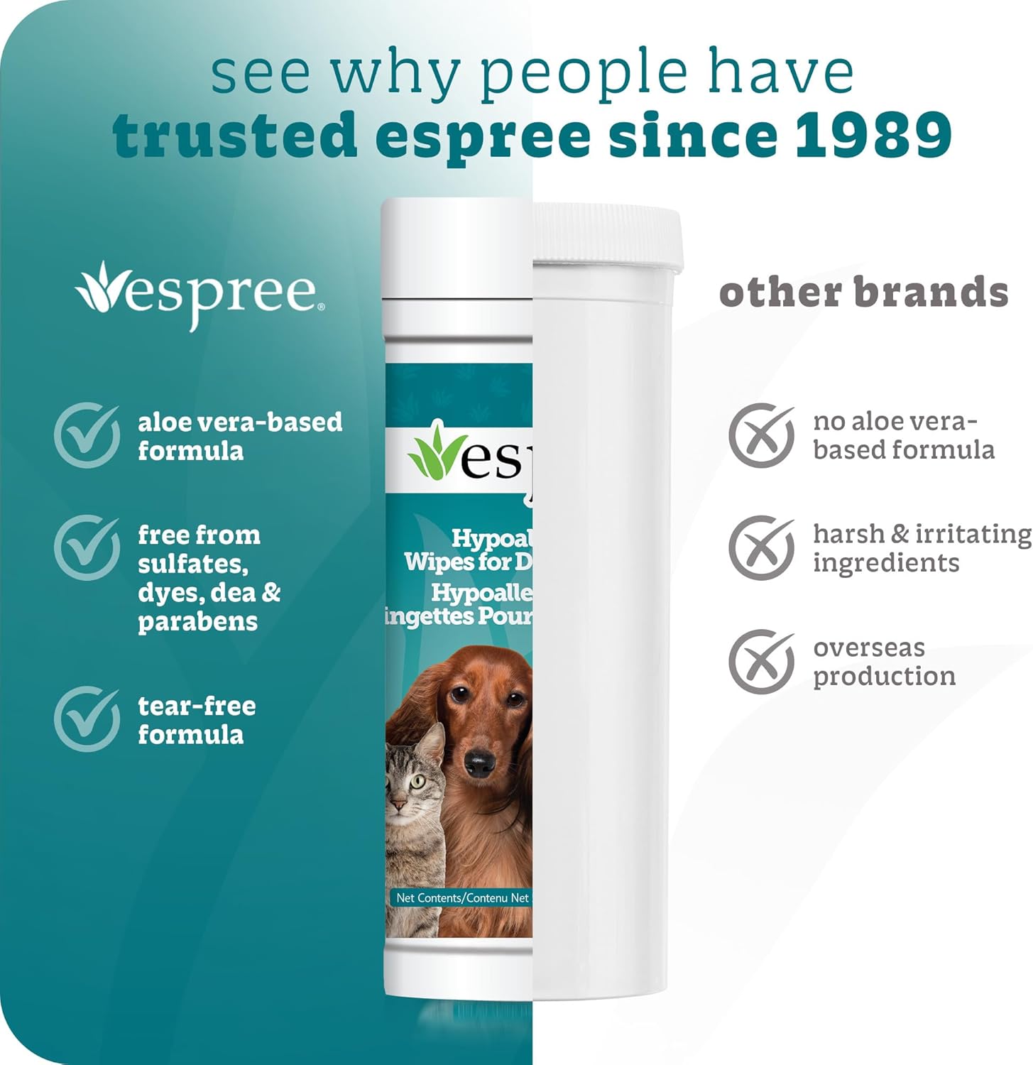 Espree Dog & Cat Hypoallergenic Aloe Wipes are specially designed to offer a gentle, refreshing clean for your pet’s sensitive skin. Infused with soothing aloe and globally sourced ingredients, these high-quality, pre-moistened wipes help remove dirt, dander, and odors while leaving your pet’s coat soft, fluffy, and touchably fresh. Perfect for daily touch-ups or between baths, Espree Aloe Wipes are hypoallergenic, free from harsh chemicals, fragrances, and dyes, making them ideal for pets with allergies or sensitive skin. The convenient, easy-to-use wipes simplify dog and cat grooming, allowing you to quickly clean paws, face, and coat wherever you are. Ideal as cat cleaning wipes or dog grooming wipes, they help maintain a healthy, shiny coat. Please note that some pets may be sensitive to any formula, so we recommend trying this on a small area initially. Trusted by professional groomers, Espree’s hypoallergenic wipes provide a reliable, gentle solution to keep your pet clean, comfortable, and beautifully maintained without irritation.