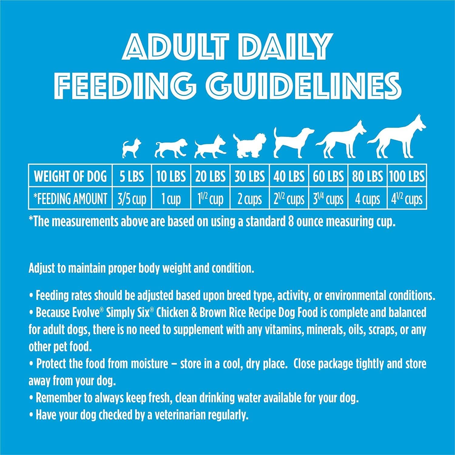 - Directions: RECOMMENDED ADULT DAILY FEEDING GUIDE Dog's Weight; Cups per Day 5 pounds; 3/5 cup 10 pounds; 1 cup 20 pounds; 1 1/2 cups 30 pounds; 2 cups 40 pounds; 2 1/2 cups 60 pounds; 3 1/4 cups 80 pounds; 4 cups 100 pounds; 4 1/2 cups Feeding amounts listed above are based on an 8 ounce standard measuring cup. Adjust food as required to maintain proper body weight and condition. EVOLVE® Simply Six® Chicken and Brown Rice Recipe Dog Food is complete and balanced for adult dogs. There is no need to supplement with any vitamins, minerals, oils, scraps or any other pet food. FRESH WATER Keep fresh, clean water available for your pet at all times.