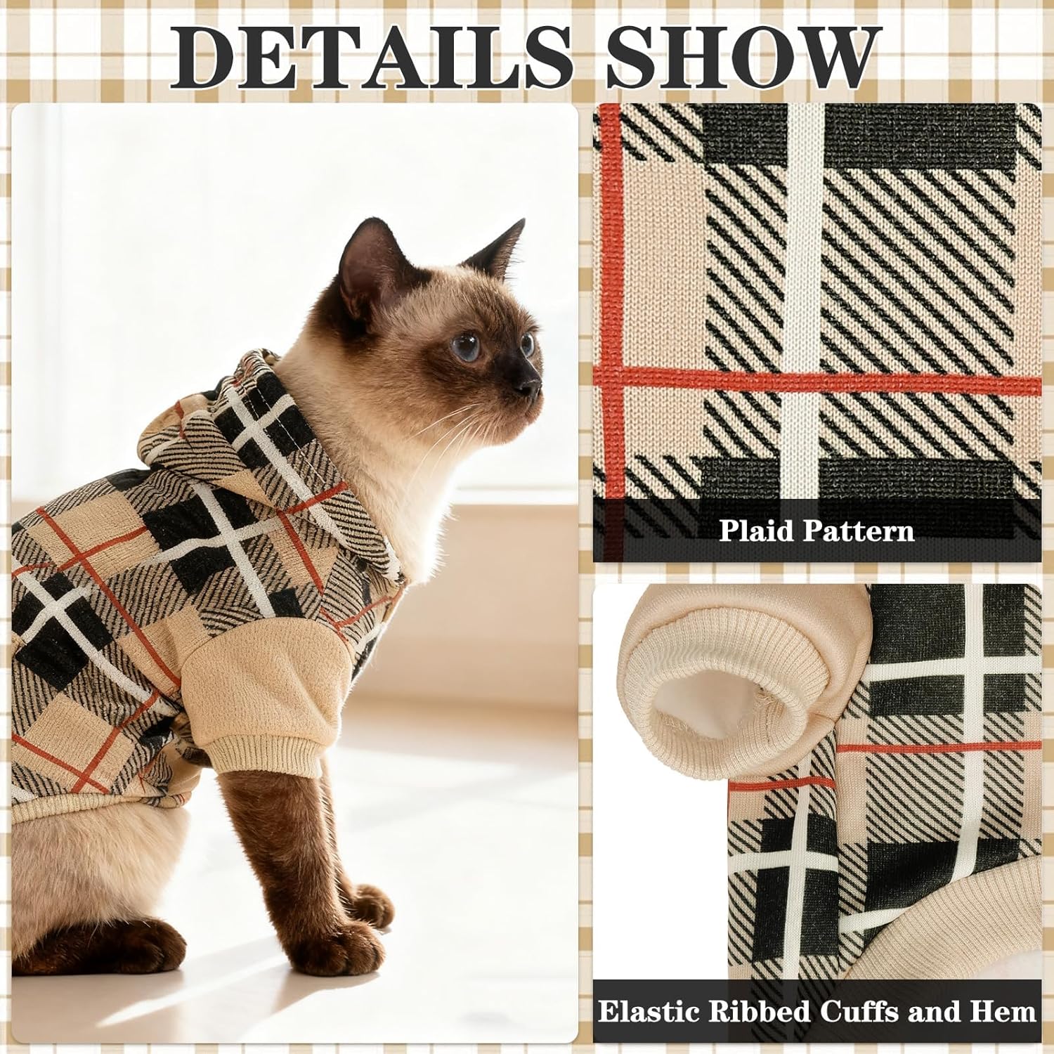 About this item Classic British Style: The British-inspired plaid design adds an extra touch of charm to this pet apparel, making your furry friend look even cuter and more fashionable when wearing it Durable Material: Crafted from 100% polyester fabric, these pet clothes are soft, comfortable, and breathable. They provide warmth for cats and dogs during cool autumn days and cold winter months. Machine washable and dryer safe Adorable Back Pocket: This cat sweater jacket features a cute little pocket on the back, perfect for stashing treats for your furry friend during outdoor walks or playtime Versatile Design for Every Occasion: Perfect for formal events, everyday wear, and outdoor adventures. This versatile piece doubles as elegant formalwear, casual attire, or cozy pajamas—making it the ideal holiday gift for your feline or canine companion Size Small: The size of this hoodie is Small, with a chest circumference of 15 inches, a neck circumference of 10 inches, and a back length of 10.2 inches, suitable for small-sized cats. Multiple sizes are available to fit kittens and puppies of various body types. Please measure your pet before purchasing to ensure a comfortable fit. Note: If your pet's size is near the edge of the size range, please select the larger size › See more product details