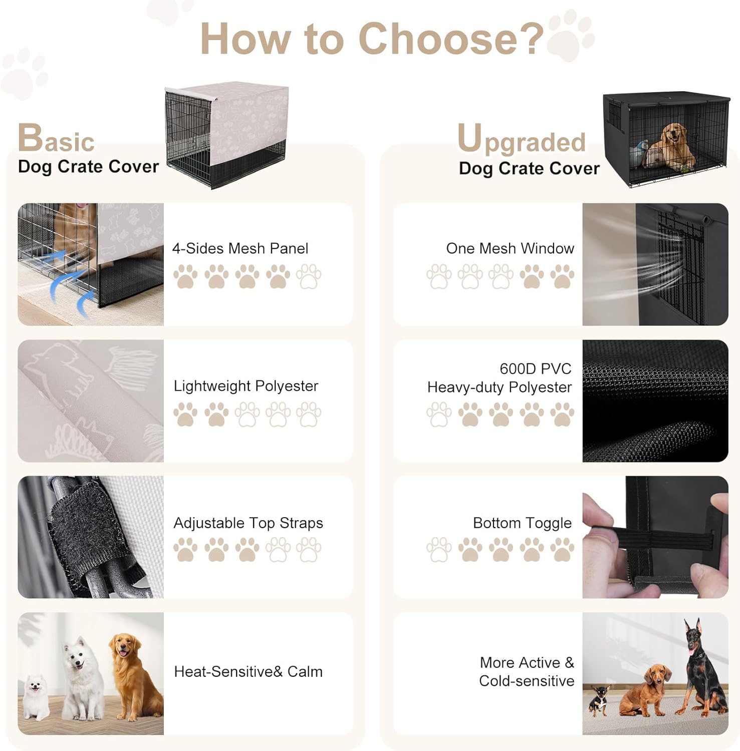 About this item 【Only Cover, Without Crate】 Dimensions: 48"L x 30"W x 33"H, offering a universal fit for most brands' 48-inch standard wire crates (compatible with 1-door, 2-door, and 3-door models, suitable for daily use or travel). 【4 Sides Mesh Ventilation】Large breathable mesh panel ensures continuous airflow. Mesh material provides adequate ventilation and visibility. 【Basic Crate Cover】This crate cover is for basic use only. Made of light synthetic material, it offers basic light blocking and good ventilation. Which provides a security and privacy space for your lovely dogs. 【Easy to Install】Simply drape the pet cover over the crate, attach the top adjustable Velcro strap, and astick the four velcro sides to secure it to the dog crate. 【Anxiety-Reducing Den:】This kennel cover creates a den-like dark space for your pet. By minimizing light penetration and blocking external distractions (movement/noise), it effectively reduces dog’s anxiety. The enclosed environment cultivates a sense of security, ideal for anxious pets during sleep, naps, rest, or travel › See more product details