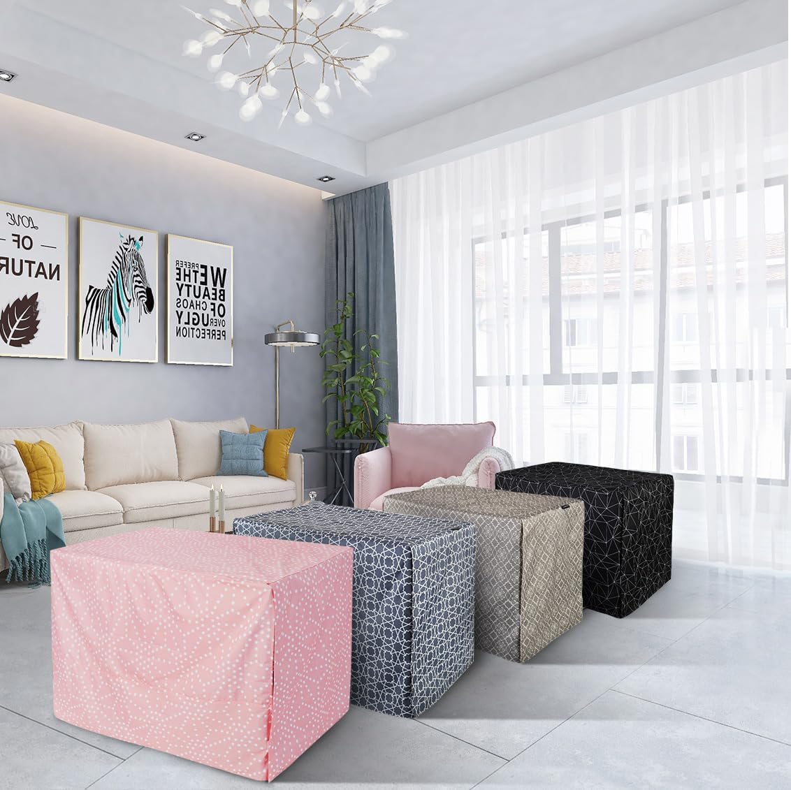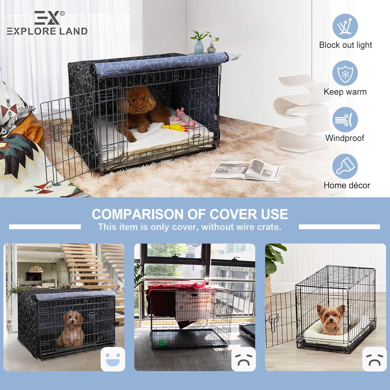About this item Only Cover, without Crate -Dimension: 24 x 18 x 20 inches, universal fit for most brand 24-inch standard wire crate. Compatible with 1-door, 2-door, and 3-door wire dog crates. Home Décor - Take the ugliness out of your pet crate and blend it into your home by adding Explore Land's printed dog crate cover! Premium Material - Dog kennel cover is made of lightweight polyester with PU coated, which blocks some of the direct sun, cut off the cold wind. Convenience - Easy to install, all you need to do is put it on the crate and stick four sides of hoop and loop to secure the dog crate. Breathable- All opening with roller shades to adjust visibility. Hoop and loop closure design provides gaps for ventilation. › See more product details